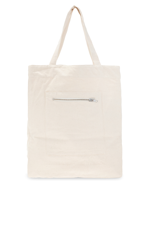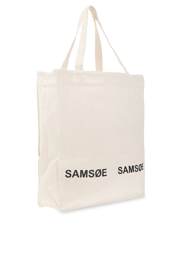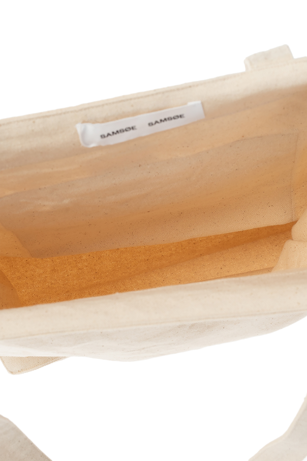 Cream shopper bag from Samsoe Samsoe. Crafted from recycled cotton, this design showcases a black graphic logo print on the front, a zipped pocket on the back, two half-round handles and one internal compartment.