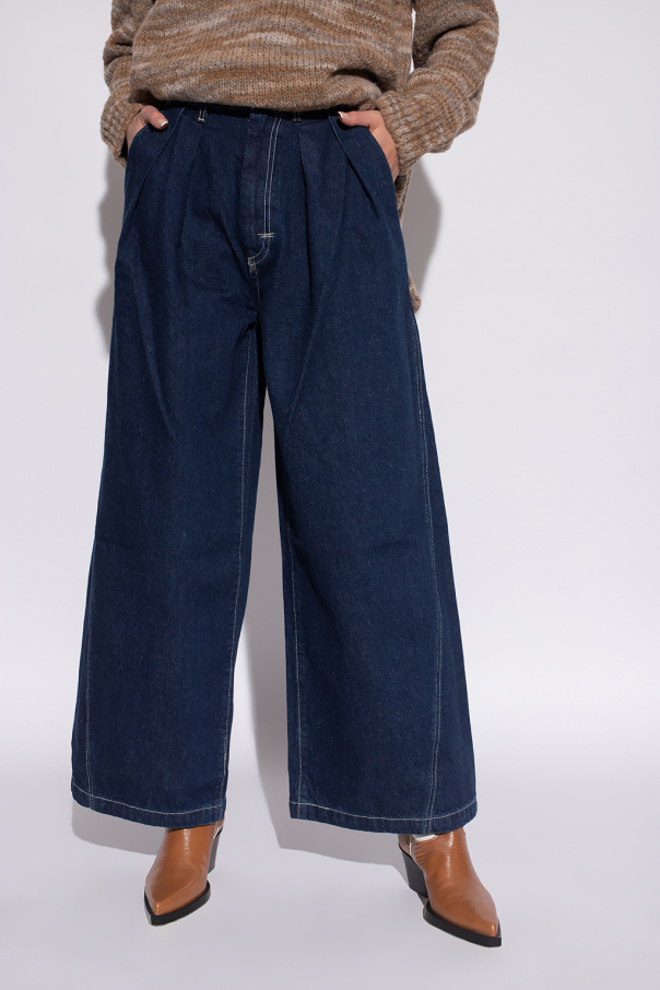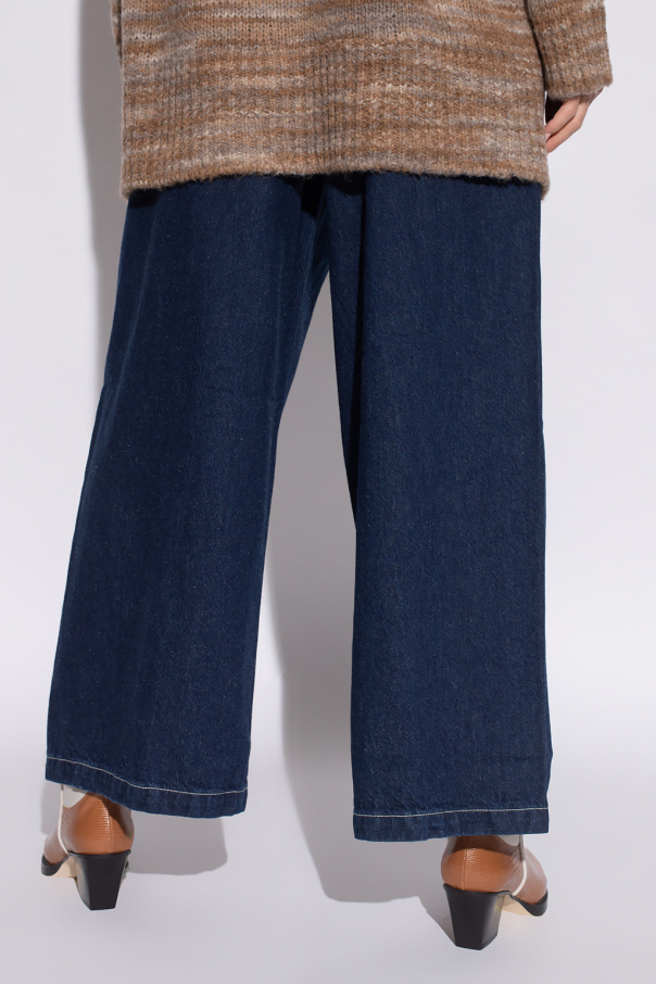 Navy blue flared jeans from Levi's, the ‘Red’ collection. Crafted from cottonised hemp with a relaxed silhouette this pair features a zip fly with a button, three slip pockets, cream stitching as well as a leather logo patch and cut-out detailing with a buckle strap on the back.