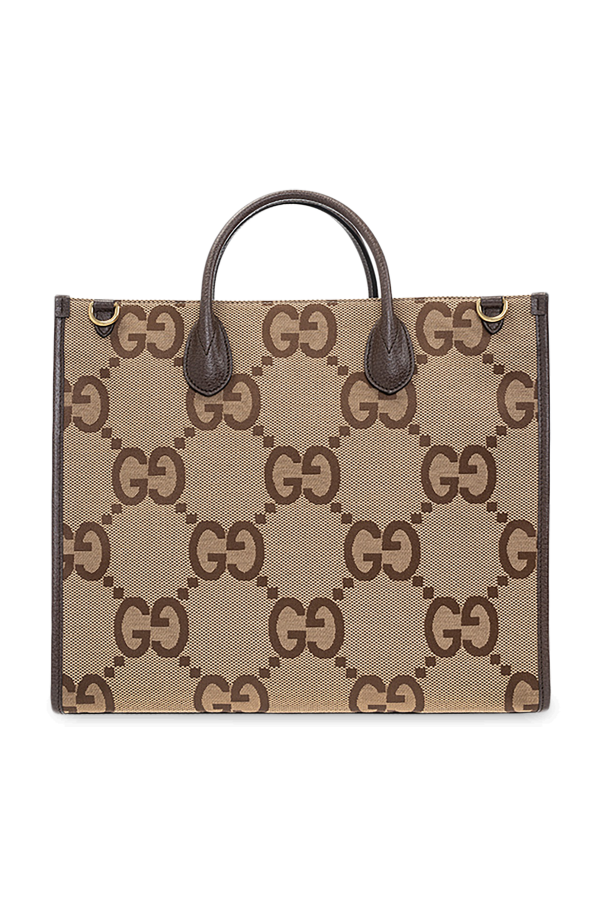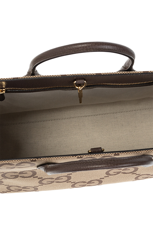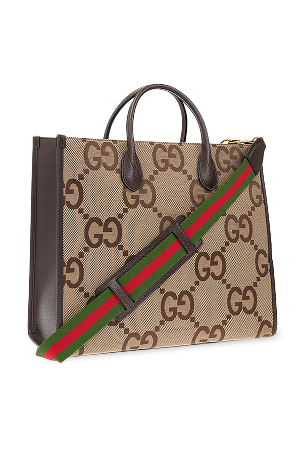 Beige and brown shopper bag from Gucci. Crafted from GG Supreme canvas with leather trims, this model features a metal closure and is decorated with a logo motif. It is complete with two half-round handles, adjustable shoulder strap with a red and green Web stripe, gold-tone metal hardware and one internal compartment with one zip pocket.