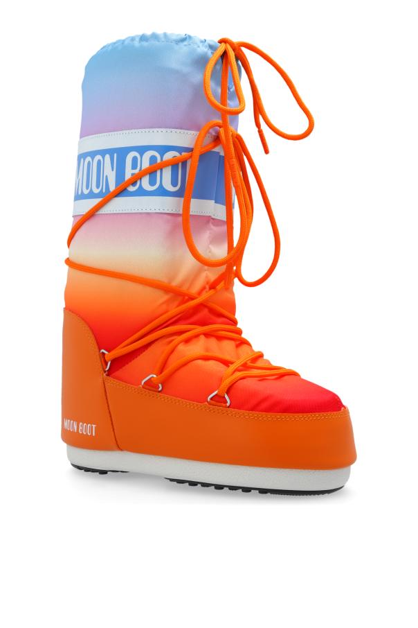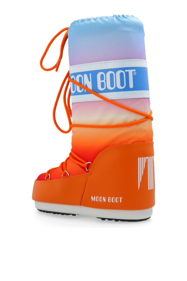 Introducing the exclusive Icon Sunrise Snow Boots from the renowned designer Moon Boot. Crafted with precision and an eye for detail, these boots are the epitome of winter luxury. The high shaft design, extending above the ankle, provides superior protection against cold and snow. The classic snow boot shape features a rounded toe and a robust rubber sole, ensuring excellent traction on snowy and icy surfaces. Made from premium synthetic materials, the upper part of the boot is both waterproof and resistant to low temperatures, while the interior is lined with a soft, light fabric for added warmth and comfort. The top edge boasts an elastic finish to prevent snow ingress. The vibrant color palette of these boots is truly eye-catching. A striking gradient transitions from a bold orange at the base, through pink, to a light blue at the top. The distinctive wide blue strap with the white "MOON BOOT" inscription adds a touch of elegance and brand identity. Additional details include orange laces that crisscross the entire length of the boot and a prominent white “M” logo on the back. These elements not only enhance the aesthetic appeal but also underscore the meticulous craftsmanship. Why Choose This Product? Designed by the legendary Giancarlo Zanatta. Exceptional warmth and comfort with a cozy interior lining. Waterproof and durable for harsh winter conditions. Unique gradient design and vibrant colors for a standout look. Robust rubber sole for superior grip on snow and ice. Iconic branding and distinctive design details.