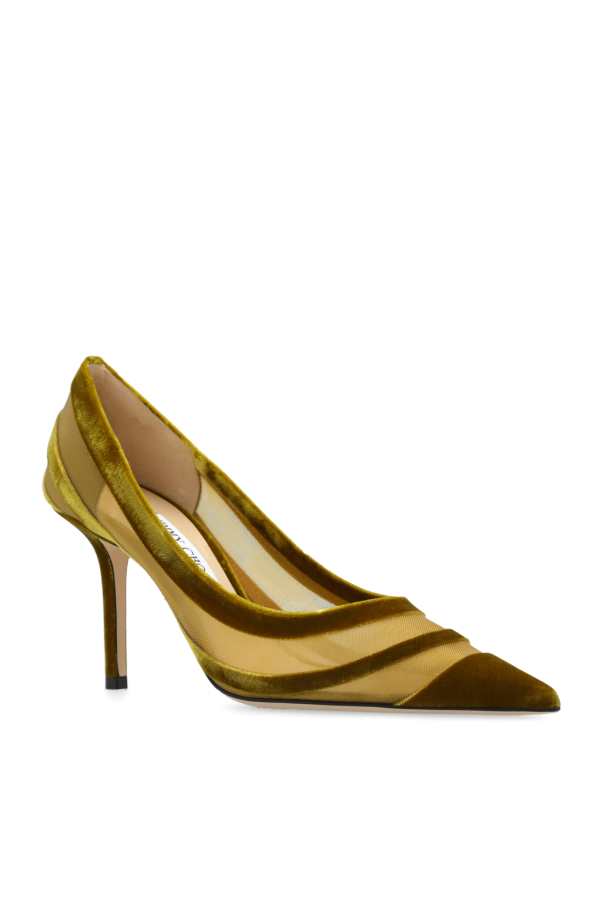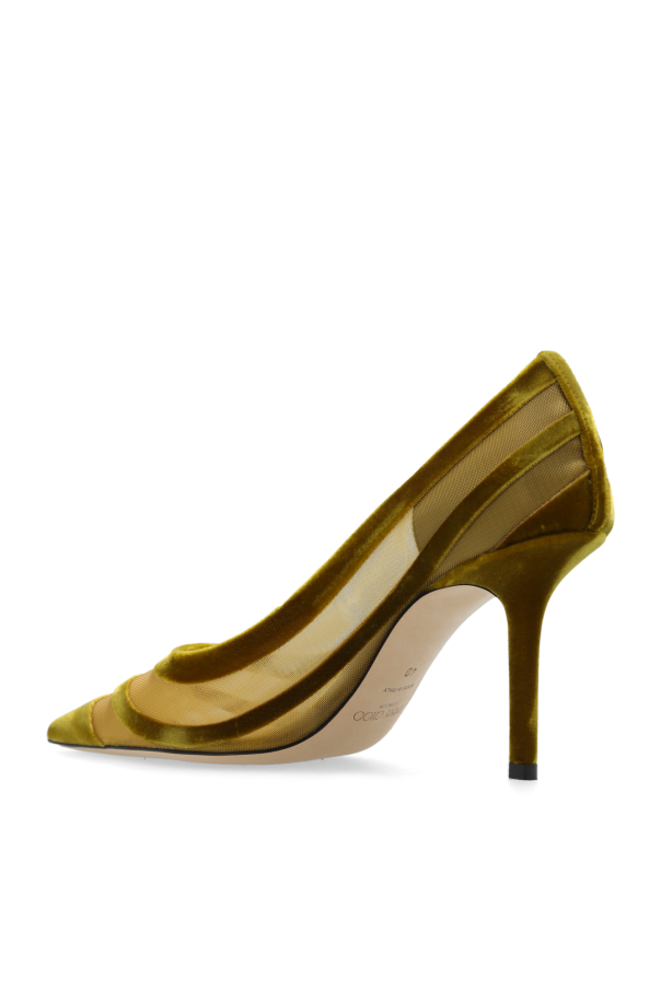 Greenish yellow ‘Love’ pumps from Jimmy Choo. Made of transparent mesh and velvet, this pointed toe pair sits on a beige leather sole.