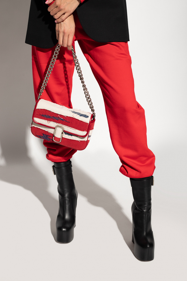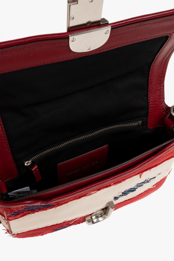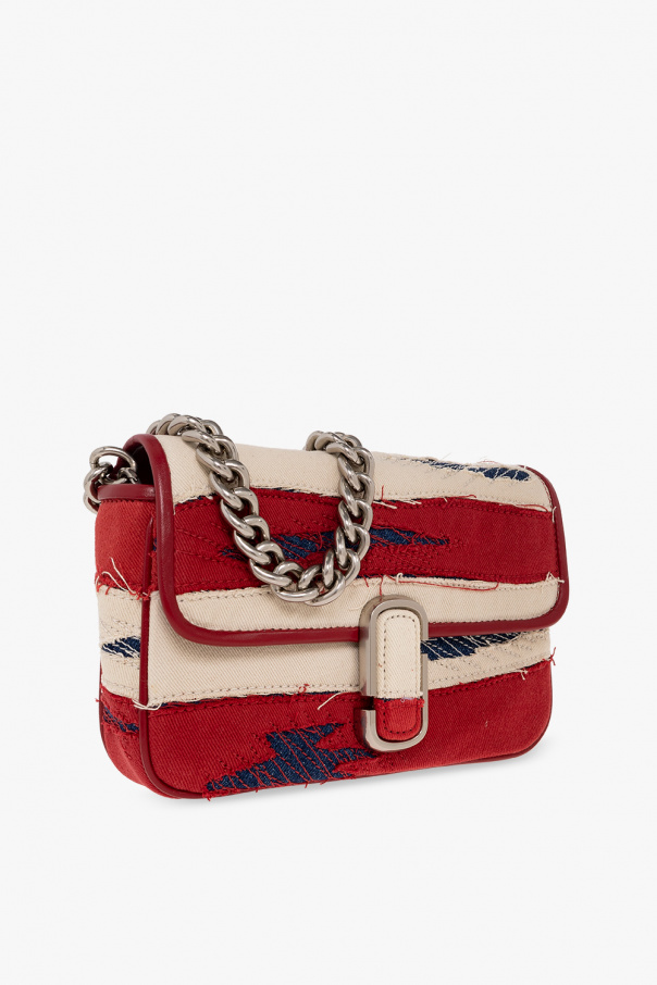 Red, cream and navy ‘The J Marc’ distressed shoulder bag from Marc Jacobs. Made of canvas with denim and leather trims, this model features a magnetic snap, stitching details, metal appliqué, back pocket, logo patch, detachable and adjustable cream strap and chain, silver-tone metal hardware and one internal compartment with one zip pocket and one slip pocket.