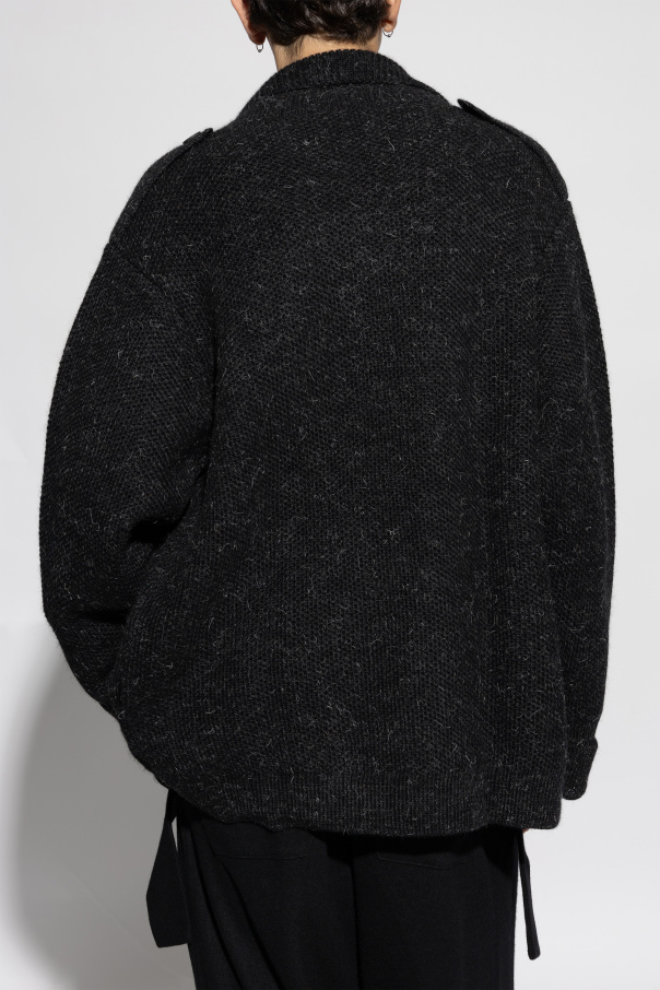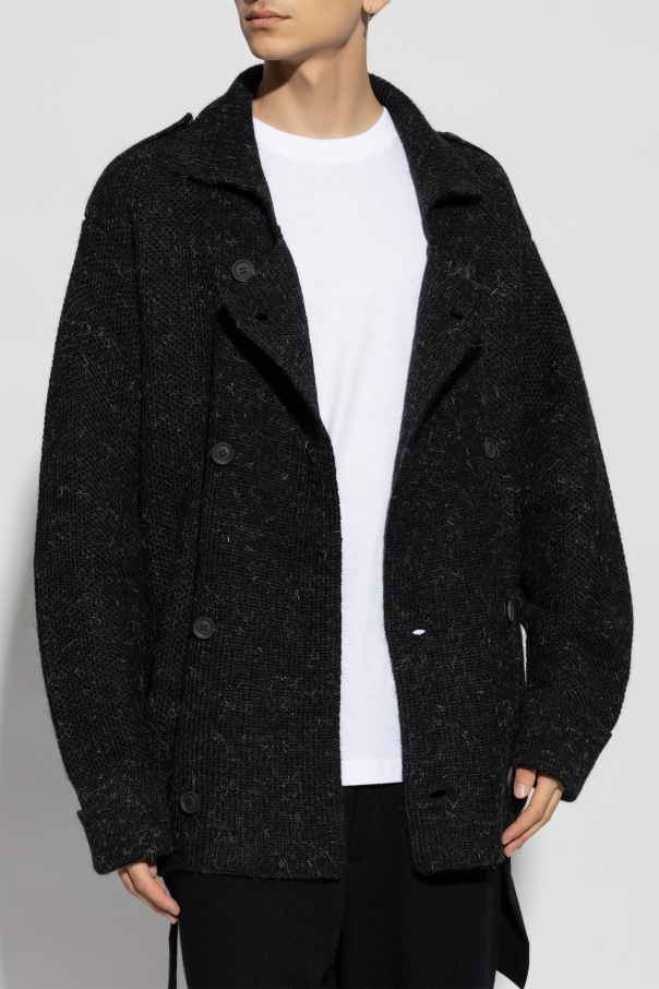 Introducing the Double-Breasted Sweater from the distinguished collection of renowned designer Yohji Yamamoto. This exquisite garment, predominantly in black, epitomizes elegance and comfort, crafted from high-quality wool for optimal warmth and softness. The sweater features a classic, loose fit with long sleeves and a broad collar, accentuated by its distinctive double-breasted design. The fabric’s melange texture imparts a refined and sophisticated appearance, making it an impeccable choice for cooler days. Noteworthy details include prominent buttons that enhance its character and elegance, additional buttons on the shoulders for a unique stylistic touch, and practical pockets. The relaxed back design ensures both comfort and freedom of movement, perfect for the modern, discerning gentleman. Why Choose This Product? Exclusive Designer: Crafted by Yohji Yamamoto, a visionary in the fashion industry known for his avant-garde and timeless creations. Premium Material: Made from luxurious, soft wool, offering warmth and comfort. Elegant Design: Double-breasted closure with large, visible buttons for a sophisticated look. Unique Details: Additional shoulder buttons and practical pockets. Versatile Style: Pairs effortlessly with various wardrobe pieces, enhancing any outfit with its universal appeal.