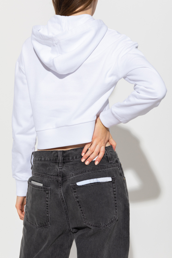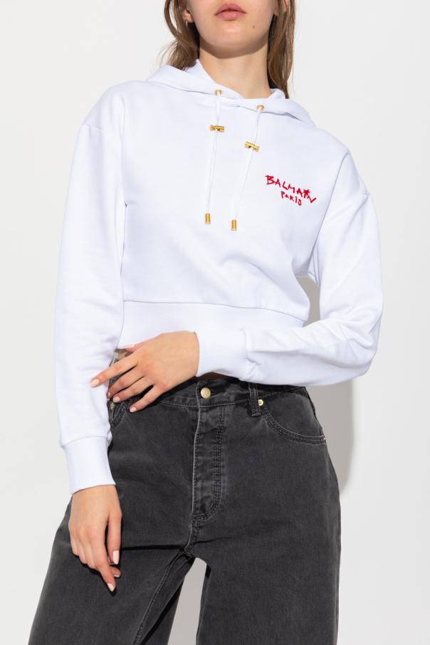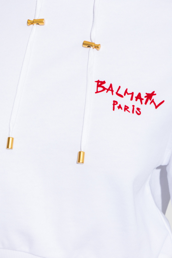 White hoodie from Balmain. Made of cotton, this garment features a red logo with a velvet finish and ribbed trims at the hem and cuffs.