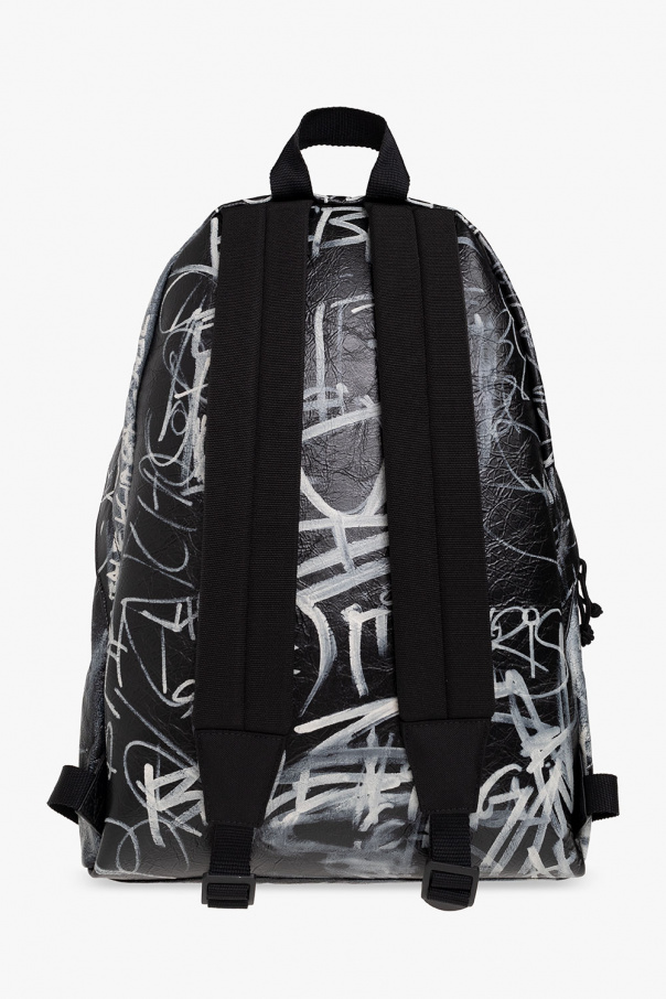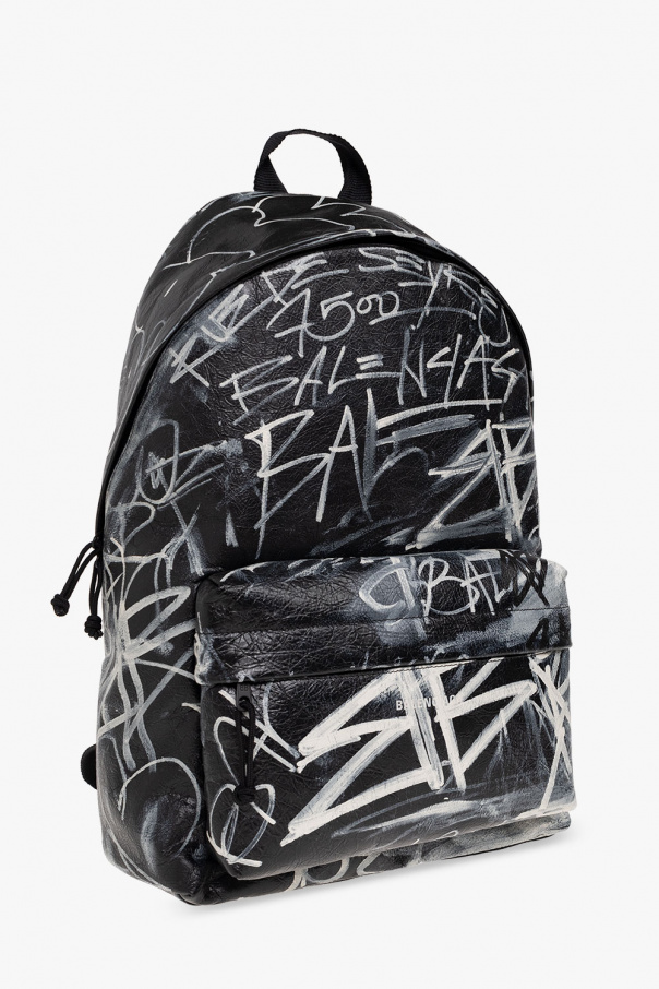 Black ‘Explorer’ backpack from Balenciaga. Made of textured lamb leather, this model fastens with a two-way zip and is decorated with a grey graffiti print. It is complete with a front zip pocket, half-round handle, adjustable shoulder straps and one internal compartment with one zip pocket and one slip pocket.