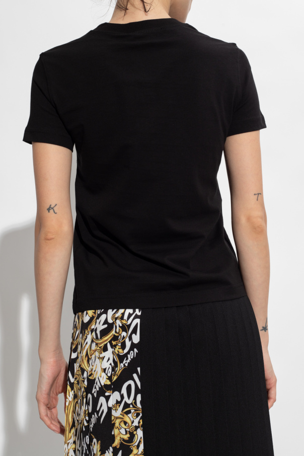 Black crewneck T-shirt from Versace Jeans Couture. Made of cotton, this short sleeve design features a gold-tone logo print.