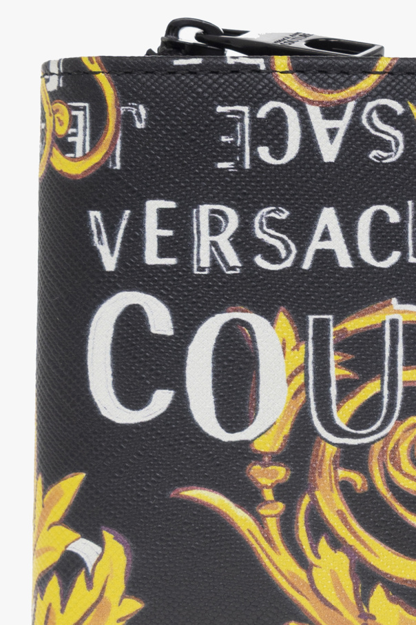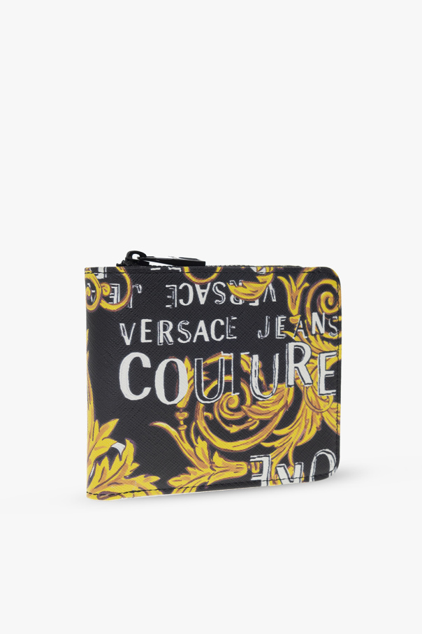 Black folding wallet from Versace Jeans Couture. Crafted from canvas decorated with the brand's ‘Logo Couture’ print, this design features a snap fastening and a leather-clad interior with a bill compartment, one zip coin pocket, two slip pockets and five card slots.