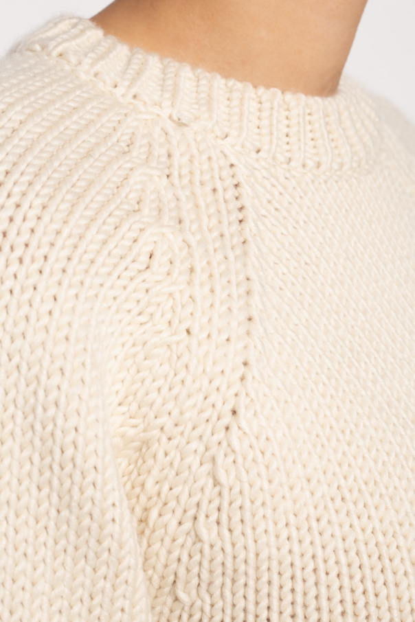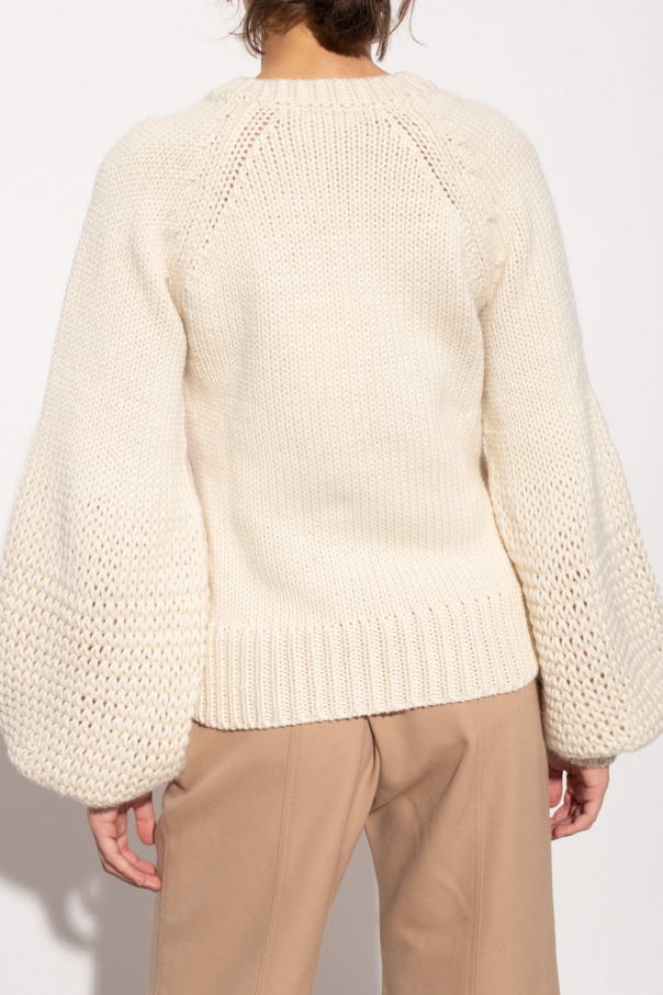 Cream sweater from Chloé. Crafted from a wool, silk and cashmere blend, this round neck design has decorative sleeves with ribbed cuffs.