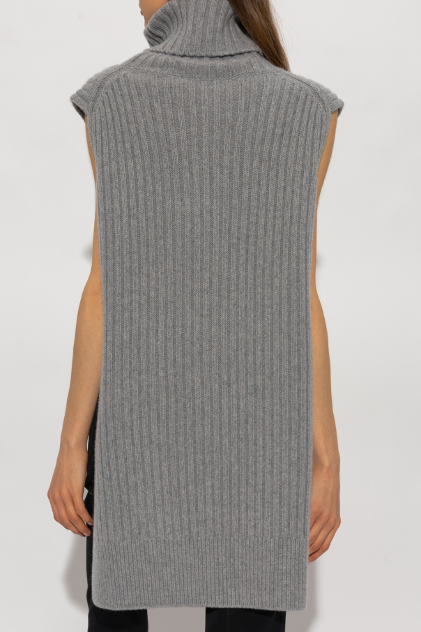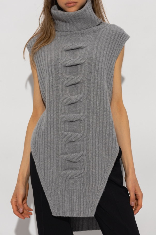 Grey vest from Stella McCartney. Crafted from a cashmere and wool blend with a relaxed fit, this style features a distinctive knit, side slits and a snug turtleneck collar.