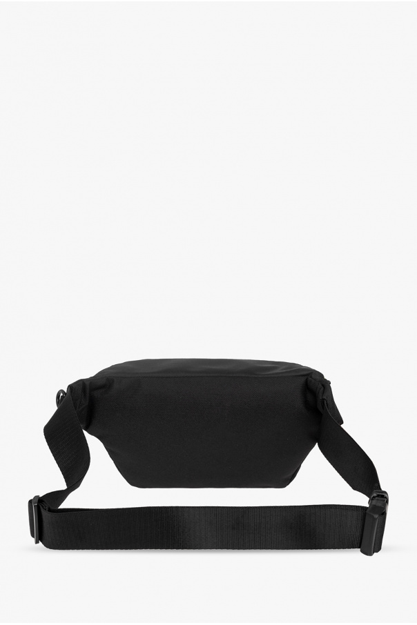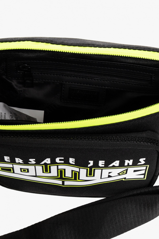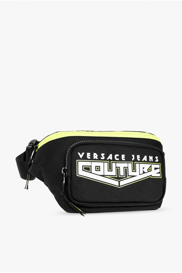Black belt bag from Versace Jeans Couture. This model features a zip fastening, front zip pocket, white logo print with rubber trims, neon green elements and one internal compartment with one slip pocket and one zip pocket.