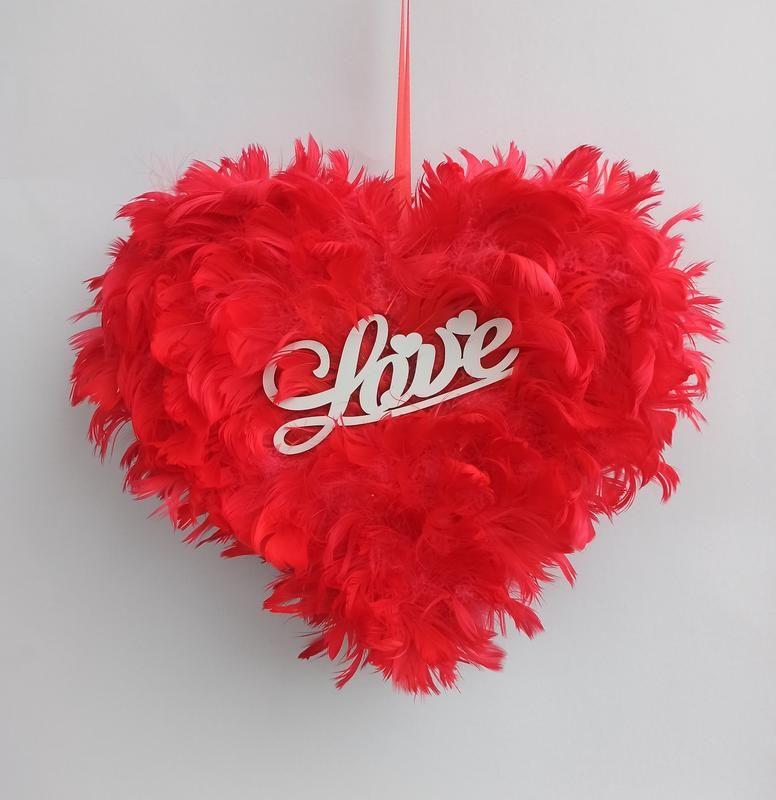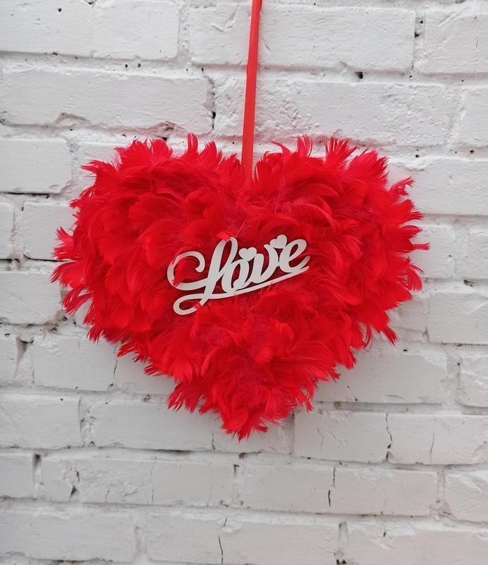 Красное сердце - декор ко дню Святого валентина на дверь, стену, декор/ оформление витрины к дню Валентина Материал - красное перо. Основа 4 см экструдированный полис, который окрашен в красный цвет Размер - ширина 38 см С обратной стороны сердце только красное. Стоимость при этом составляет 300 грн Если перьев будет с обратной стороны также, то стоимость 370 грн