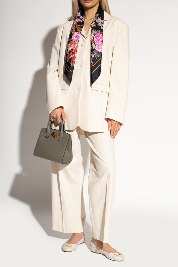 Cream and beige ‘Alice’ ballet flats from Michael Michael Kors. Made from monogrammed canvas, this model sits on a brown rubber sole and features a distinctive bow with a padlock on the front.