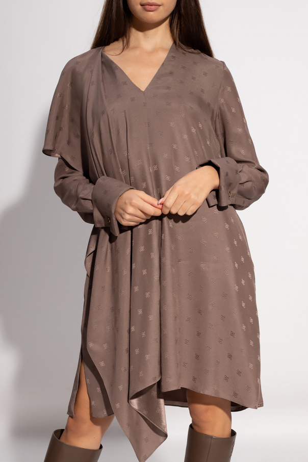 Brown dress from Fendi. Made of silk, this style showcases a logo pattern, distinctive trims, two slip pockets and sleeves with cuff link closures.