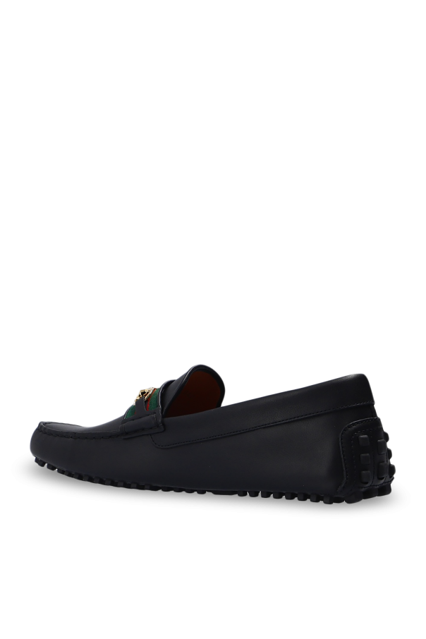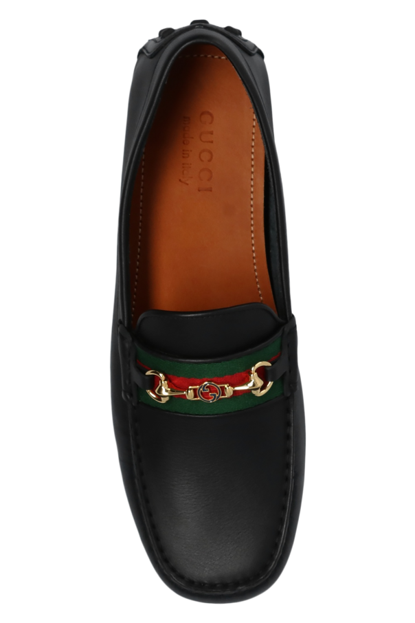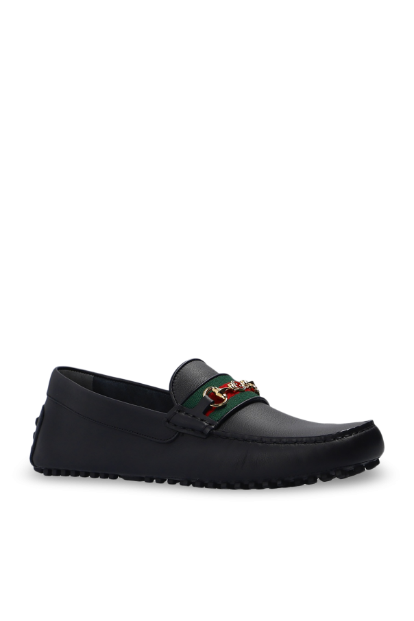 Black moccasins from Gucci. Emblazoned with the brand's signature green-red-green Web stripe and a gold-tone horsebit, this leather-crafted pair sits on a black rubber sole.