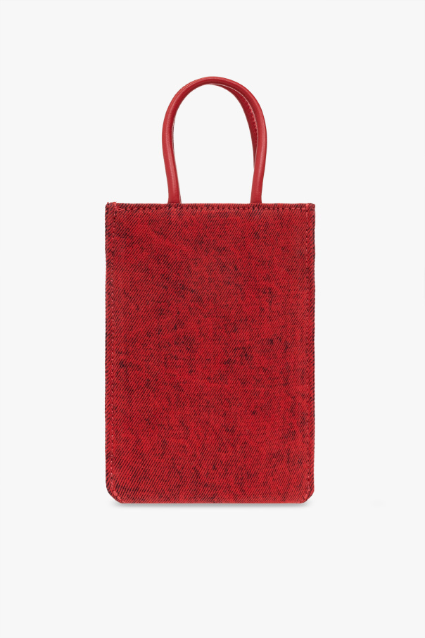 Red and navy blue shoulder bag from Diesel. Rendered in denim, this design showcases a tactile logo on the front, two half-round handles, a detachable and adjustable shoulder strap, silver-tone metal elements and one internal compartment.