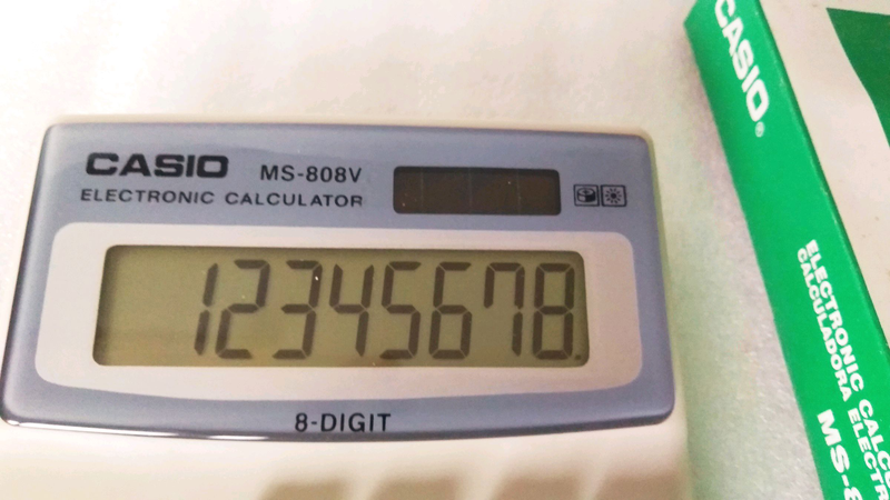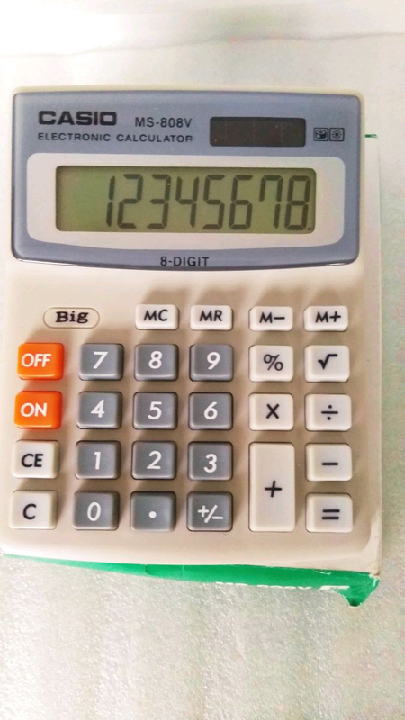 Кілька примірників у наявностіКалькулятор настільний CASIO MS — 808 для дому та офісу має 8 розрядний рідкокристалічний дисплей із фіксованим кутом нахилу та великими чіткими цифрами.Калькулятор виконує всі прості операції, включно з витримкою квадратного кореня та відсотками. Є функція пам'яті ( кнопки: M+, M —, MRC). Передбачено автоматичне вимкнення калькулятора через певний час у стані бездіяльності, для економії живлення. Ця модель калькулятора працює на батарейці-таблетці G10 (елемент 389).