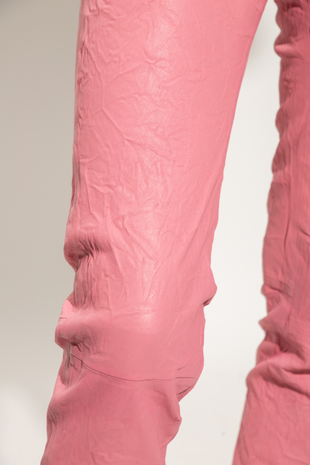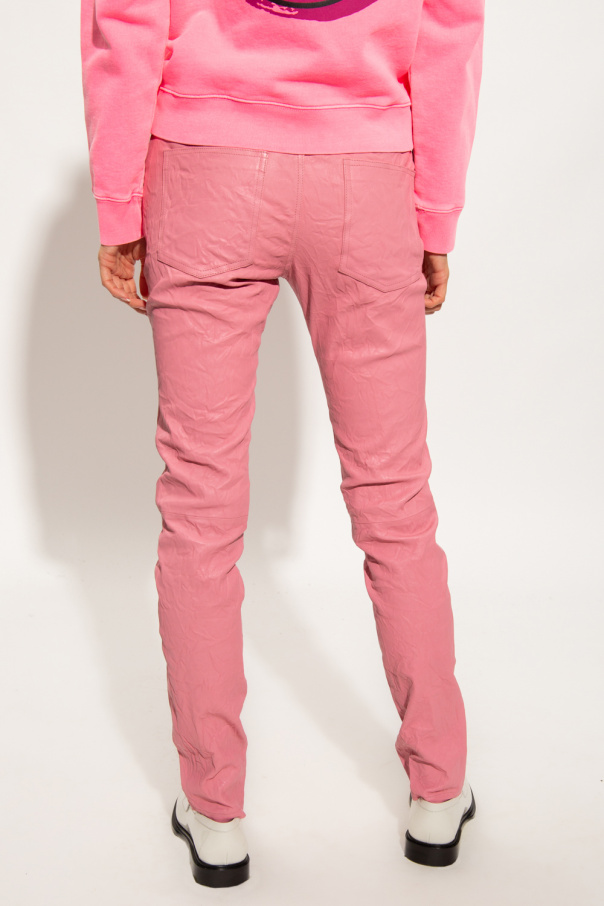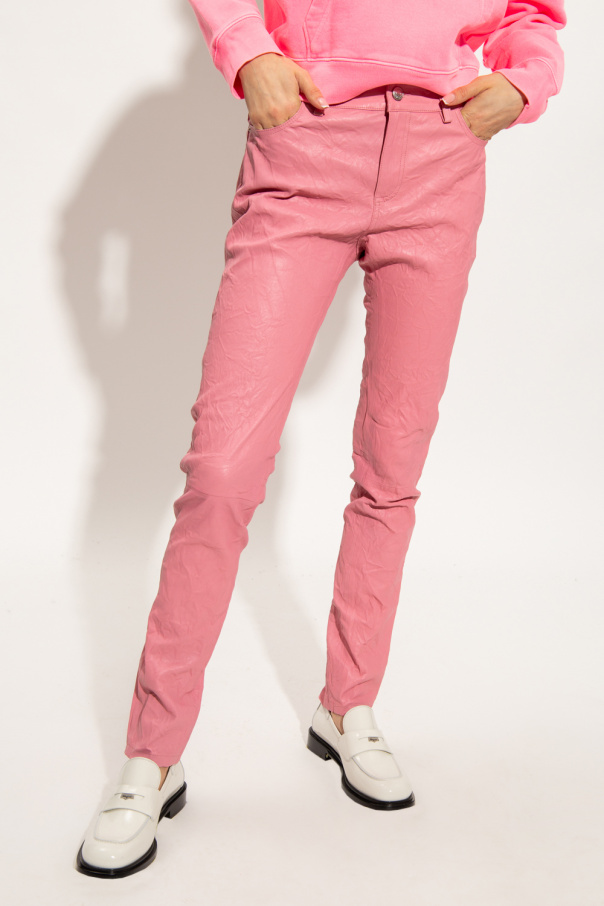 Pink ‘Phalme’ trousers from Zadig & Voltaire. Made of lamb leather with a creased effect, this pair falls down with tapered legs and is complete with a button and zip closure, three front pockets and two back pockets.