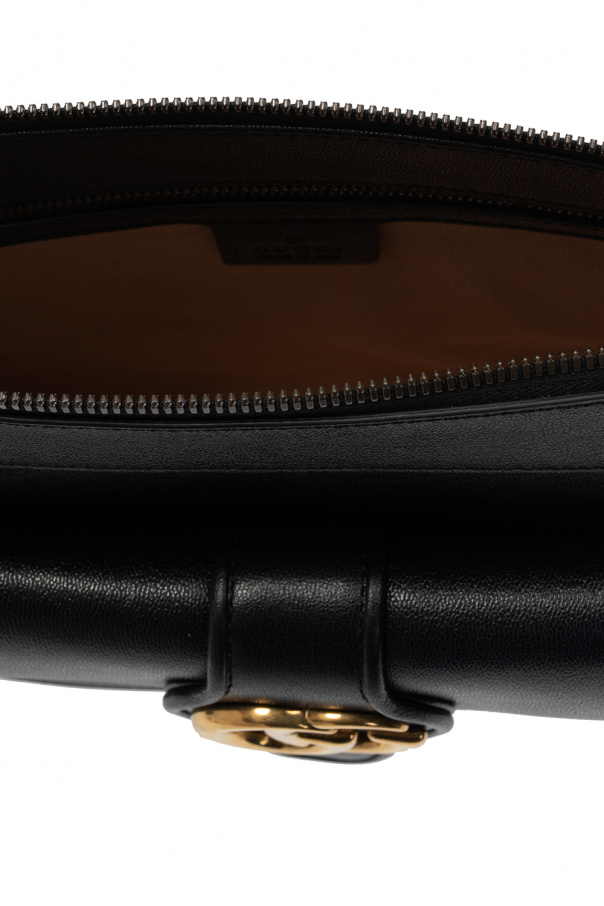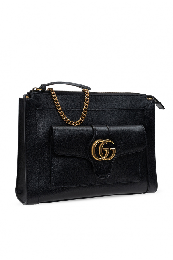 Black 'Dahlia' shoulder bag from Gucci. Made of calf leather, this design secures with a zip and showcases a gold-tone metal logo emblem, a snap-fastened flap pocket on the front, a detachable chain shoulder strap, gold-tone metal hardware and a beige-clad interior with one compartment, one zip pocket and one slip pocket.