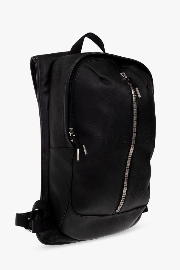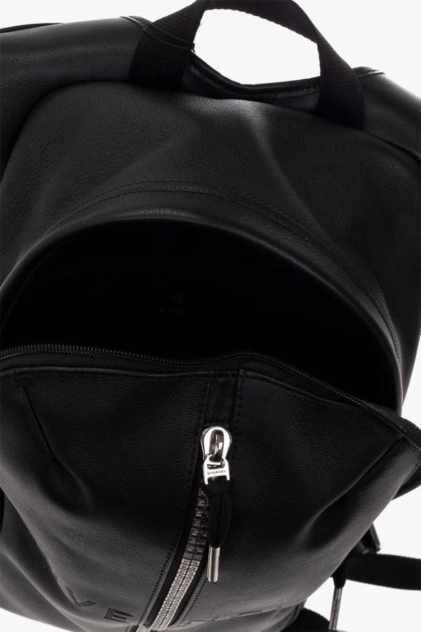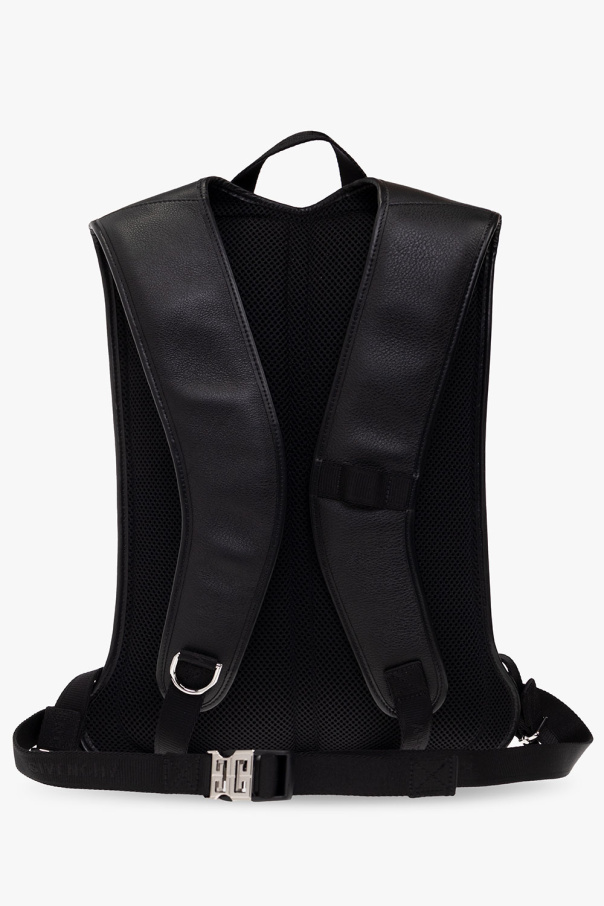 Black ‘G-Zip’ backpack from Givenchy. Crafted from calf leather and trimmed with sporty mesh, this design secures with a two-way zipper and showcases an embossed logo on the front, a zipped pocket, a top handle, adjustable shoulder straps connected via a buckle strap, silver-tone metal hardware and one internal compartment with a slip pocket.