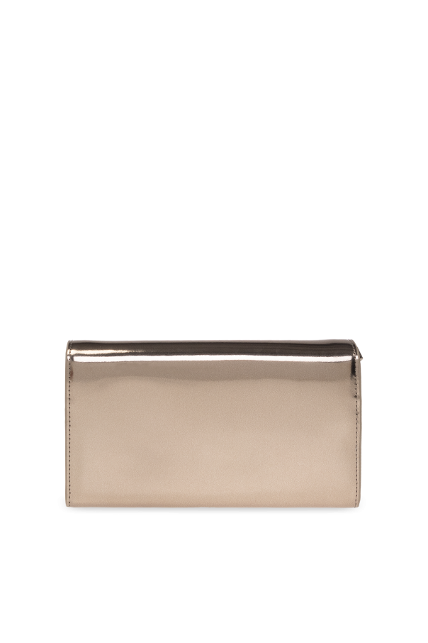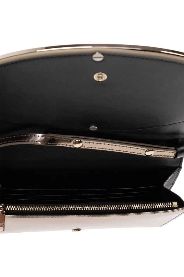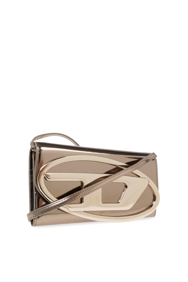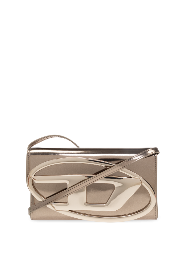 Grey wallet from Diesel. Made of patent leather, this item fastens with a snap and is complete with a logo detail, adjustable strap and metal hardware in gold-tone. It has one internal compartment with one zip pocket, two slip pockets and four card slots.
