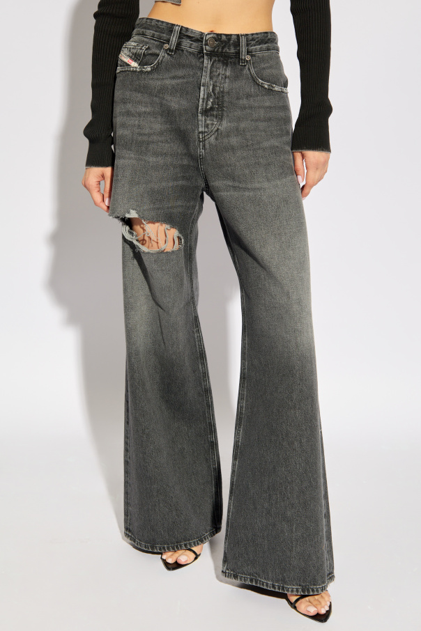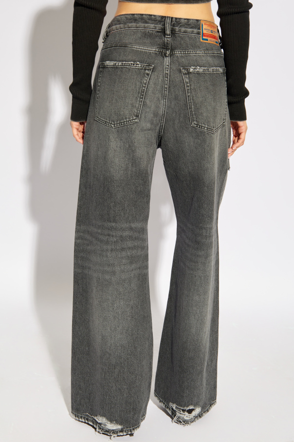 Introducing the '1996 D-SIRE L.32' jeans by Diesel, a nostalgic nod to vintage charm with a contemporary twist. Crafted with precision, these jeans feature a dominant faded black hue, evoking a sense of time-honored elegance. The high-waisted design with subtly flared legs deviates from the traditional skinny silhouette, offering a modern interpretation of the classic. The deliberate distressing above the knee on the left leg infuses an edgy character into these jeans, while the classic rear pockets, adorned with a colorful designer logo patch, underscore the garment's premium identity. Attention to detail is evident in the meticulously executed stitching, button closure, and the designer's signature label, seamlessly integrated into the waistband. Constructed from a blend of 80% Cotton and 20% Elastane, these jeans promise unparalleled comfort and flexibility, making them an indispensable addition to your wardrobe. The traditional zipper and button fastening, coupled with five functional pockets, blend practicality with style. Why Purchase This Product? Exclusive Design: Stand out in Diesel's uniquely crafted '1996 D-SIRE L.32' jeans, featuring a loose fit for a relaxed yet fashionable look. Vintage Aesthetic: The faded black color and intentional distressing offer a vintage appeal that doesn't compromise on style. Exceptional Quality: Made with a high cotton content, these jeans ensure breathability and comfort, while the addition of Elastane provides flexibility. Iconic Branding: The colorful logo patch is a testament to Diesel's renowned design ethos, adding an exclusive touch to your ensemble.