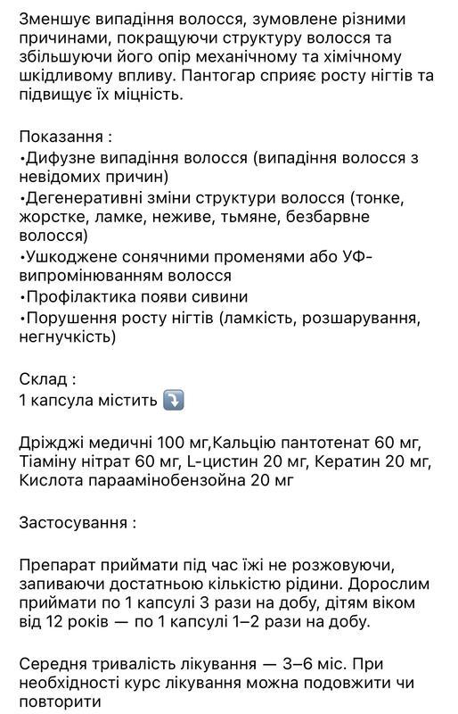 Вітаміни для зміцнення волосся і нігтів пантогар pantogar в 1 упаковці 90 капсул, єгипет ціна 1 упаковки. Вітаміни для зміцнення волосся і нігтів пантогар pantogar в 1 упаковці 90 капсул, єгипет Дані вітаміни призначені для лікування та профілактики дифузного випадіння волосся (випадання волосся з невідомих причин). Дегенеративні зміни структури волосся (тонке, жорсткі, ламкі, тьмяні, мляві волосся). Пошкодження волосся внаслідок дії сонячних променів або УФ-випромінювання. Профілактика сивини. Порушення росту нігтів (ламкість, розшарування, втрата пластичності) Склад: Дріжджі медичні 100 мг Кальцію пантотенат 60 мг Тіаміну нітрат 60 мг L-цистин 20 мг Кератин 20 мг Параамінобензойна Кислота 20 мг Країна виробник: Єгипет.