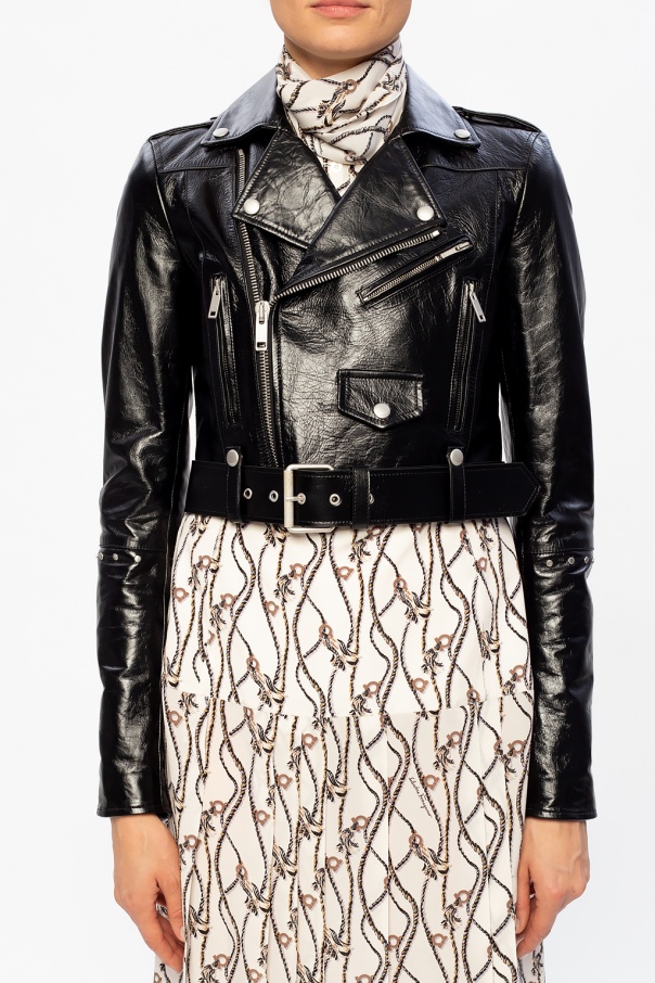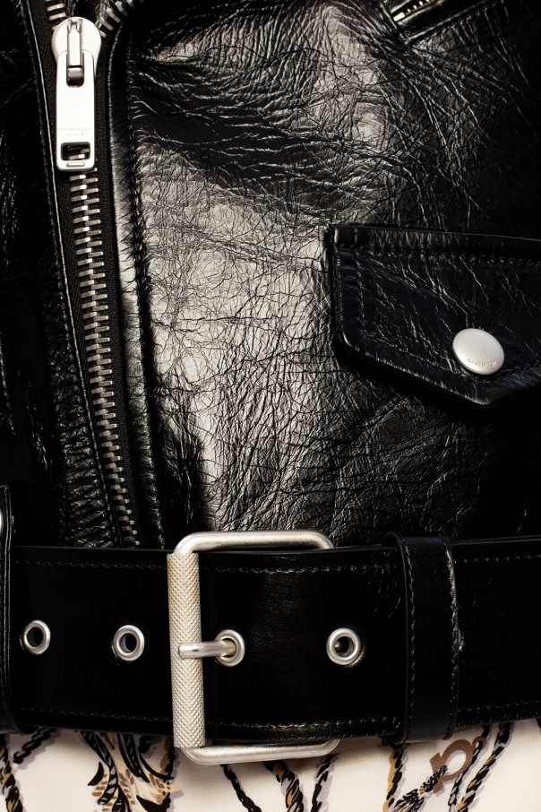 Black biker jacket from Givenchy. Crafted from textured calf leather, this style secures via zip and buckle strap and employs three zip pockets and one snap-fastened flap pocket on the front. The whole design is topped with distinctive silver-tone hardware.
