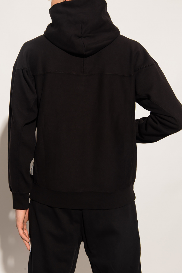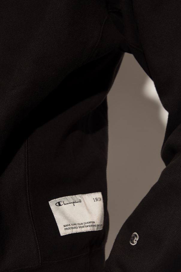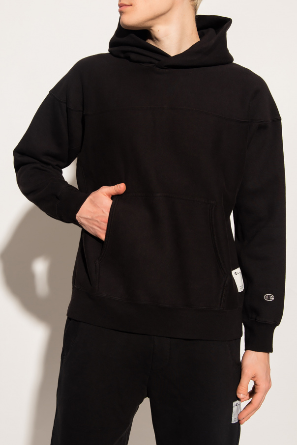 Black hoodie from Champion. Crafted from cotton jersey, this style features a slip pocket on the front, a logo patch on the side and sleeve and elasticated trims on the edges.