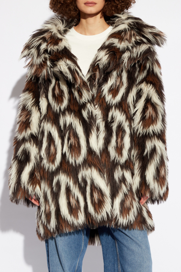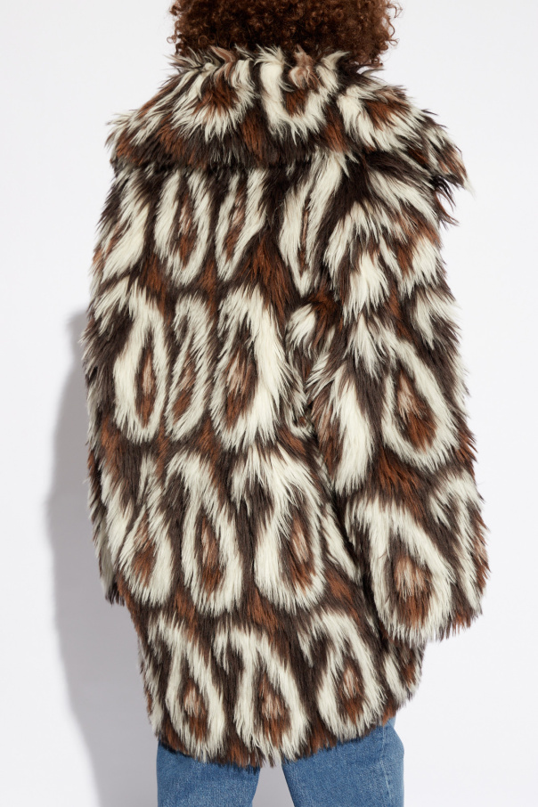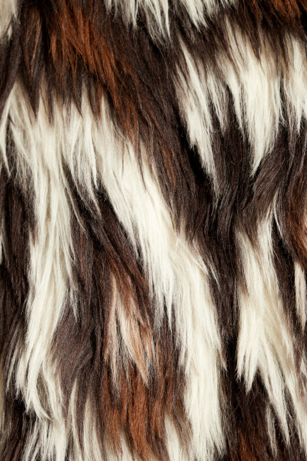 Brown and white shearling coat from Etro. Made of an alpaca wool blend, this style fastens via a hook & eye closure and features a collared neckline, long sleeves, two frontal slip pockets and a white lining embellished with a brown stripe pattern and logo.