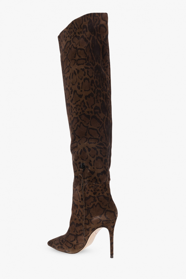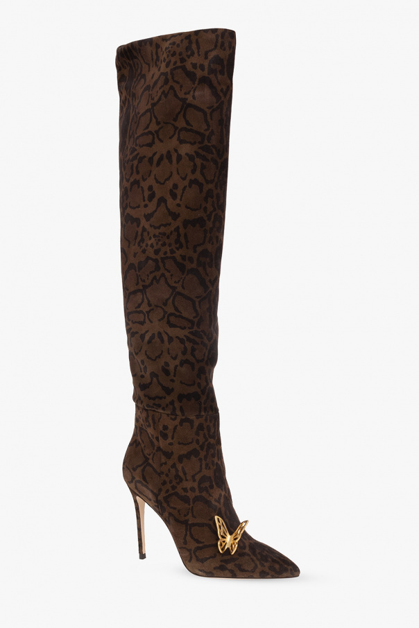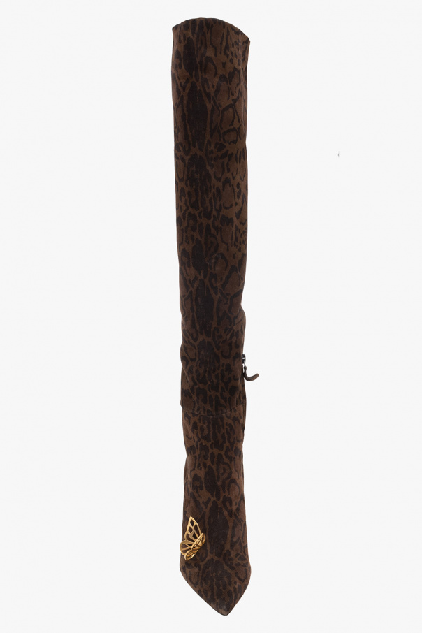 Brown and black ‘Mariposa’ heeled over-the-knee boots from Sophia Webster. Crafted from suede with a leopard print, this model features a ruched upper that can be pulled down below the knee for versatility, the brand's signature gold-tone butterflies hardware, a pointed toe and a beige leather sole.