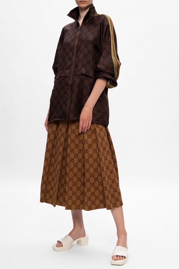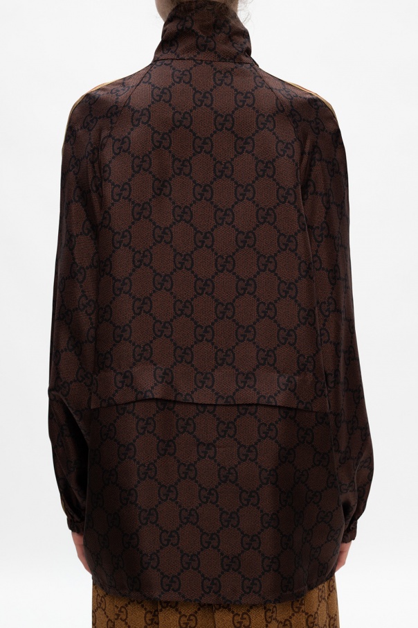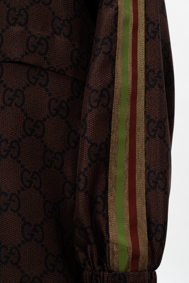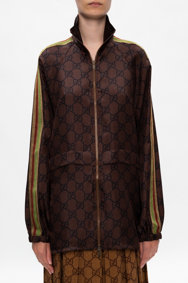 Brown track jacket from Gucci. Cut from luxurious silk, this piece of clothing fastens via two-way zip closure and showcases the label's iconic GG pattern throughout. It also features distinctive bands in gold-tone lurex yarn along the sleeves, two slip pockets and elasticated cuffs.