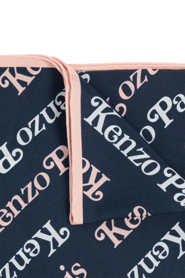 Navy blue shawl from Kenzo. Made of silk, this item showcases a pink and blue logo pattern.