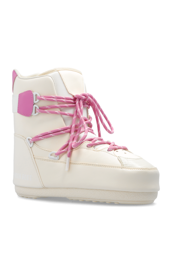 Cream and pink ‘Sneaker Mid’ snow boots from Moon Boot. Made of waterproof material, this lace-up model sits on a cream tread rubber sole with suction cups to ensure superb grip on any surface and showcases a perforated front and a printed logo. This model is inspired by basketball style, while its oversized, insulated silhouette is reminiscent of the original 1969 design.