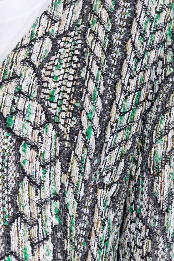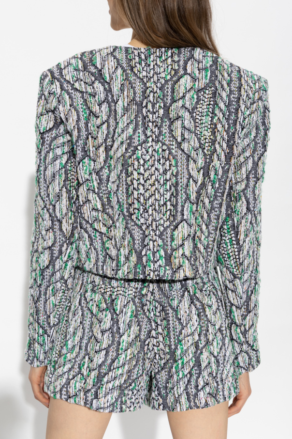 Grey, green and cream cropped jacket from Iro. Made of tweed, this long sleeve design features multicolored stitching details, padded shoulders and two slip pockets.
