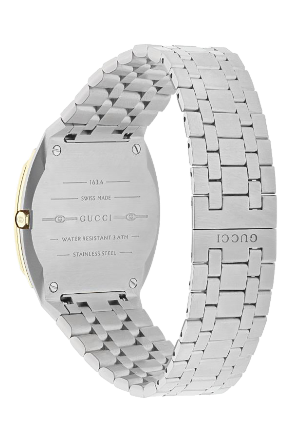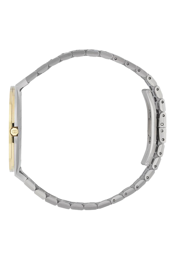 Gold- and silver-tone ‘25H’ quartz watch from Gucci. The watch is presented with a 38mm stainless steel multi-layered case plated with 18k yellow gold, brass dial with Interlocking G motif, five link stainless steel bracelet with logo-engraved closure and sapphire glass with antireflective coating.