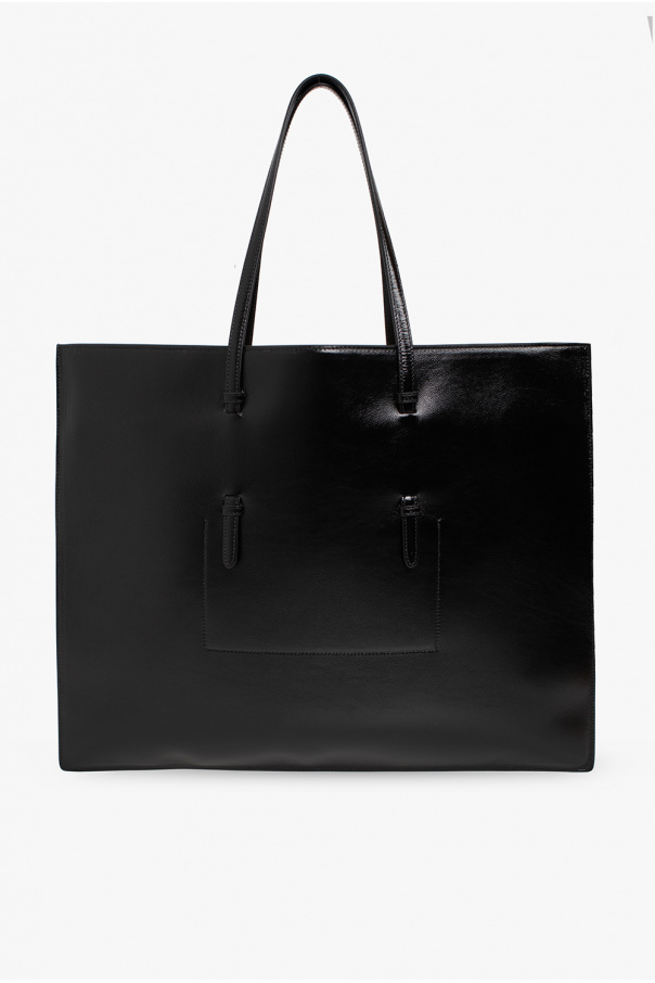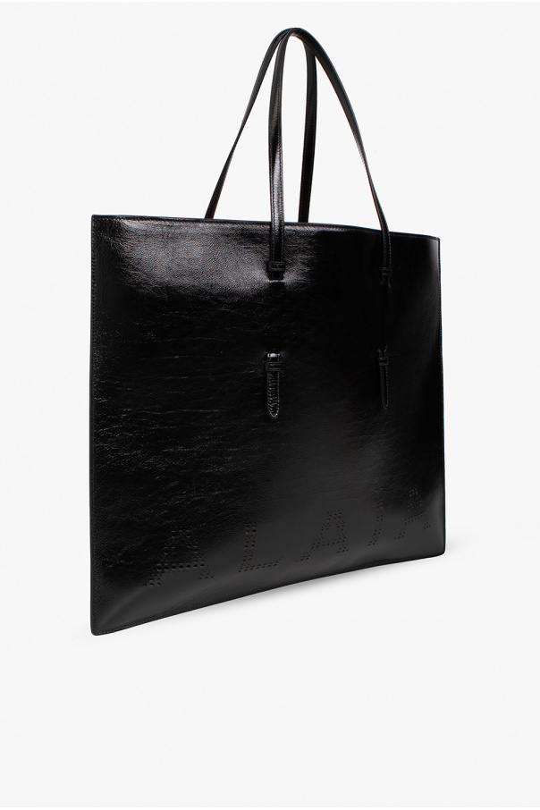 Black ‘Flat Mina Large’ shopper bag from Alaia. Crafted from calf leather with an antique effect texture, this model is complete with a zip fastening, openwork logo, two half-round handles, two half-round handles, silver-tone metal hardware and one internal compartment with one slip pocket.