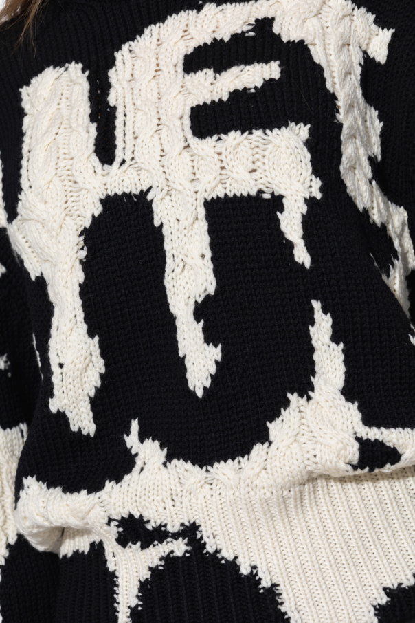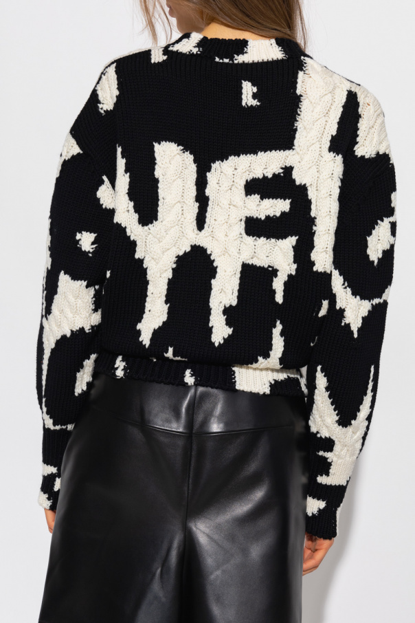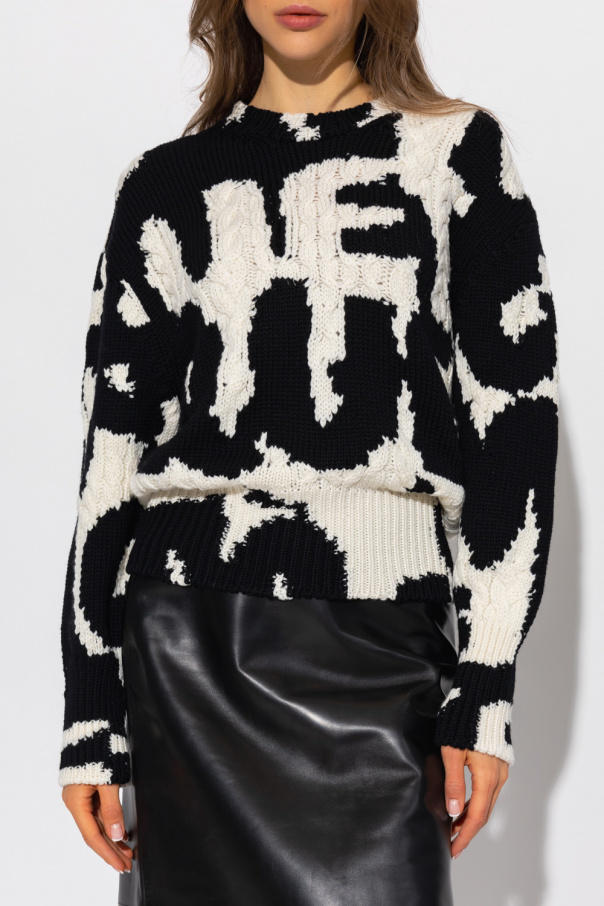 Black and white crewneck sweater from Alexander McQueen. Made of wool, this style showcases the brand's McQueen Graffiti pattern, decorative stitching and ribbed trims on the collar, bottom hem and cuffs.
