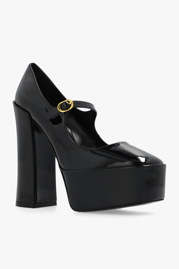 Black ‘Sky High’ platform pumps from Stuart Weitzman. Made of patent leather, this pair features an adjustable buckle strap, rounded toe, chunky heel and black leather sole with rubber trims.