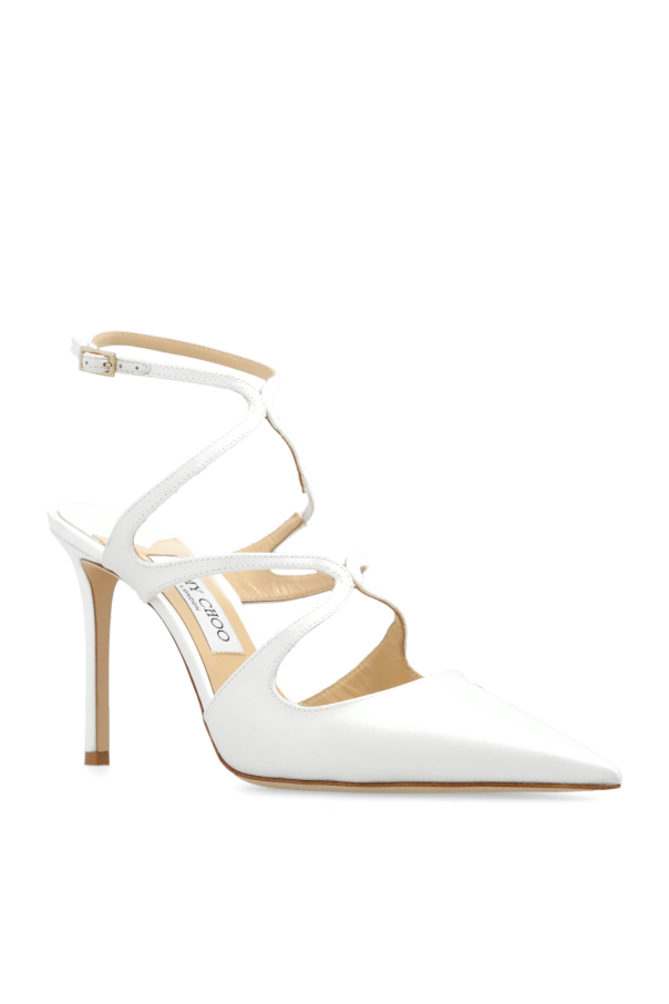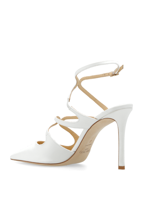 White ‘Azia’ pumps from Jimmy Choo. Made of satin, this pair sits on a cream leather sole and features an adjustable buckled ankle strap, decorative cut-out front and a pointed toe.