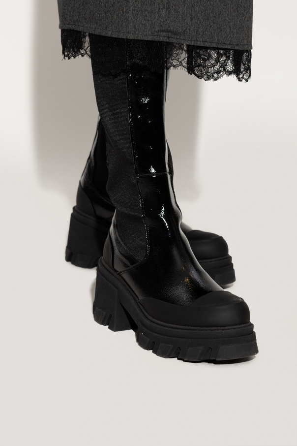 Black slip-on heeled boots from Ganni. Made of patent leather, this pair features elastic side panels, two pull straps, rubber trims, raised logo at the back, grosgrain stripe and black chunky rubber sole.