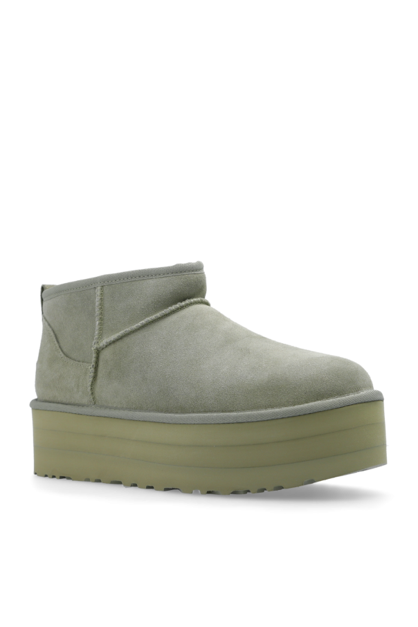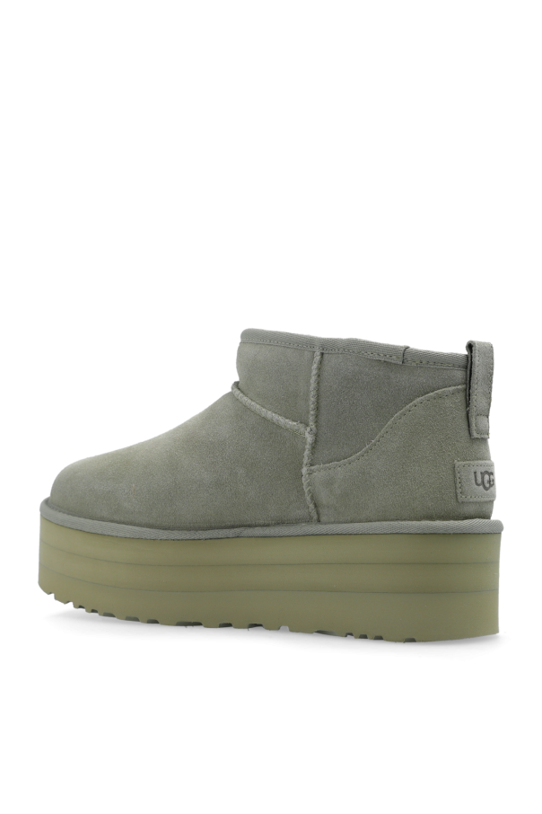 Greenish grey ‘Classic Ultra Mini Platform’ snow boots from UGG. Made of Twinface sheepskin, this pair features a logo patch at the back, 100% recycled textile binding, UGGplush™ lining and greenish grey by UGG™ outsole crafted from EVA.
