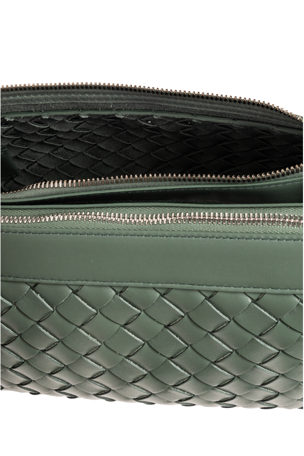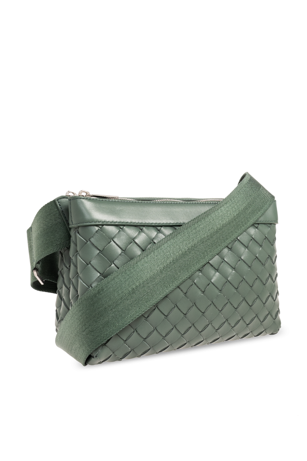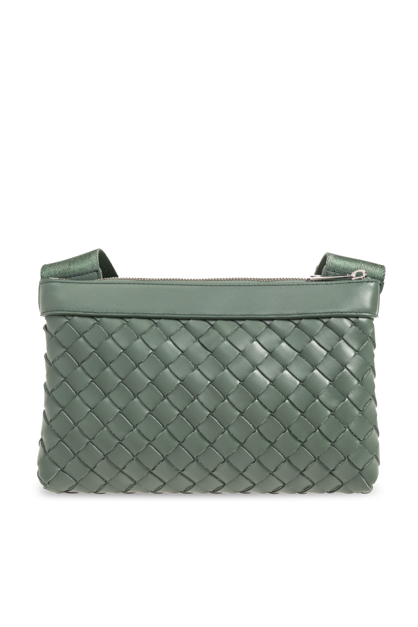 Greenish-grey ‘Classic Duo’ shoulder bag from Bottega Veneta. Made of calf leather, this design secures via zips and is made up of two parts, connected by snaps. It showcases the brand's signature Intrecciato weave, silver-tone metal hardware as well as an adjustable shoulder strap and two internal compartments.