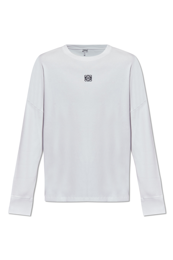 White crewneck T-shirt from Loewe. Made from ribbed cotton with a relaxed fit, this style showcases an embroidered black logo on the front, long sleeves and an elasticated collar and cuffs.