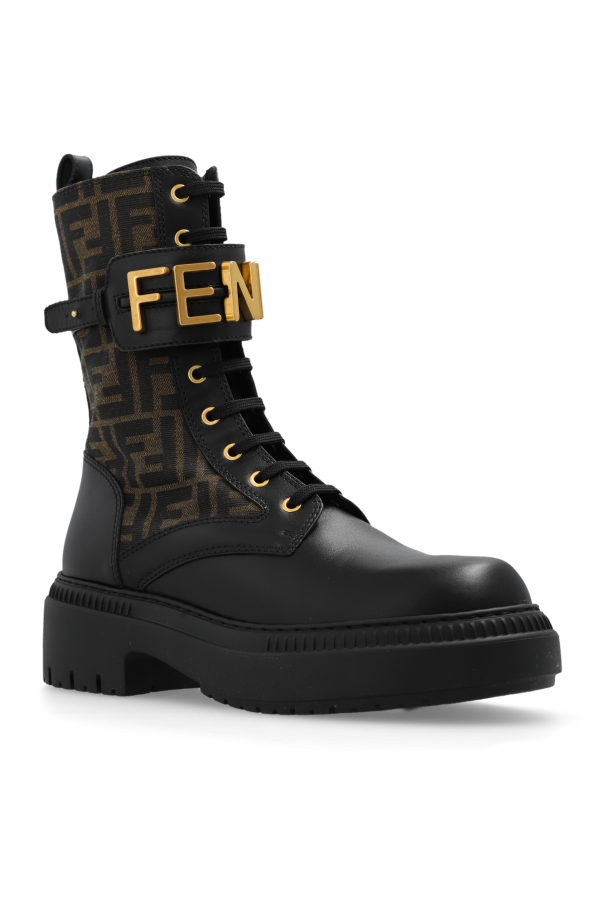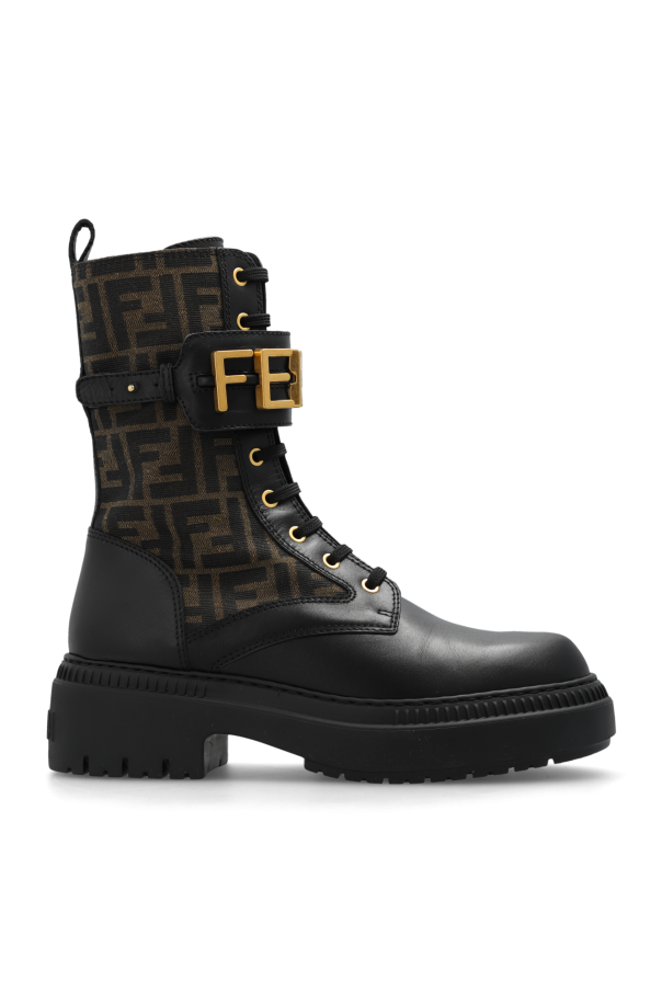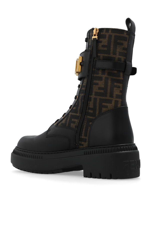 Black and brown ‘Fendigraphy’ ankle boots from Fendi. Made of monogrammed canvas, this lace-up model sits on a black rubber sole and features a side zip accompanied by an adjustable strap with a logo plaque and gold-tone metal hardware.