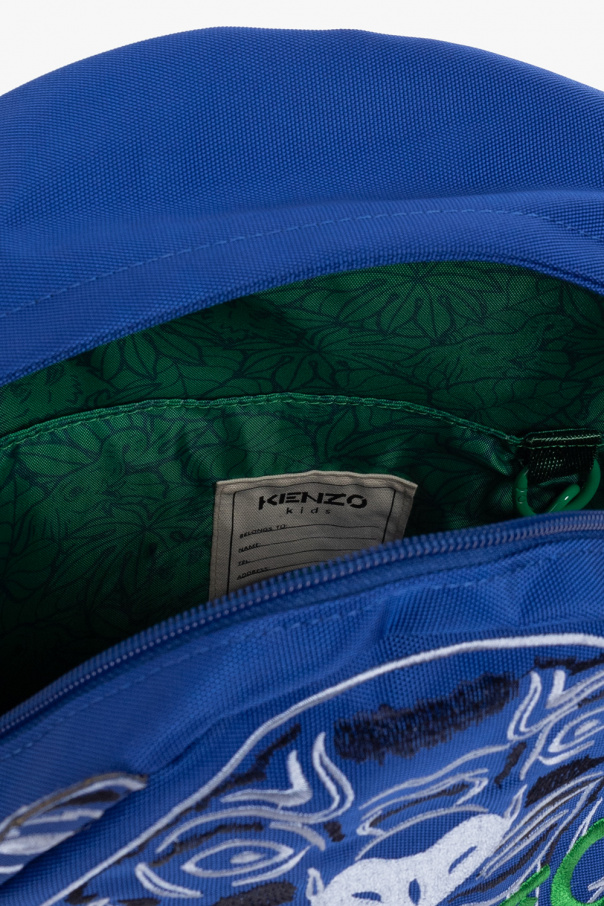 Navy blue backpack from Kenzo Kids. Emblazoned with an animal motif, this design secures with a two-way zipper and features a zip front pocket, a half-round handle, adjustable shoulder straps, navy blue metal hardware and one internal compartment with one slip pocket and an attached zip pouch.