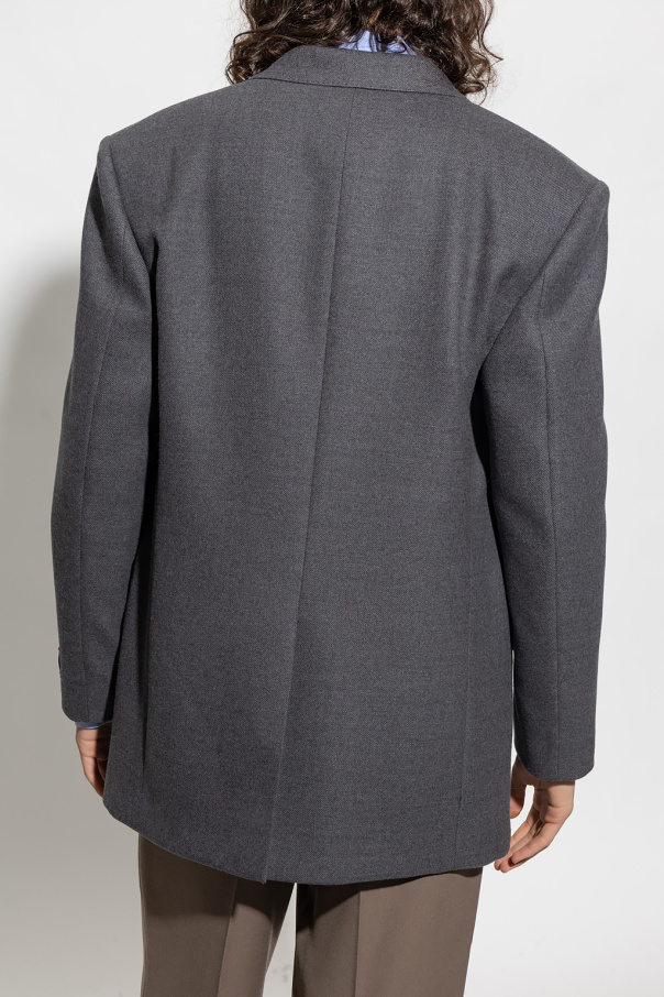 Grey blazer from Gucci. Made of wool, this long sleeve design features peak lapels, logo patch and single rear vent.