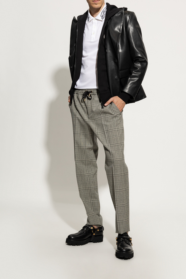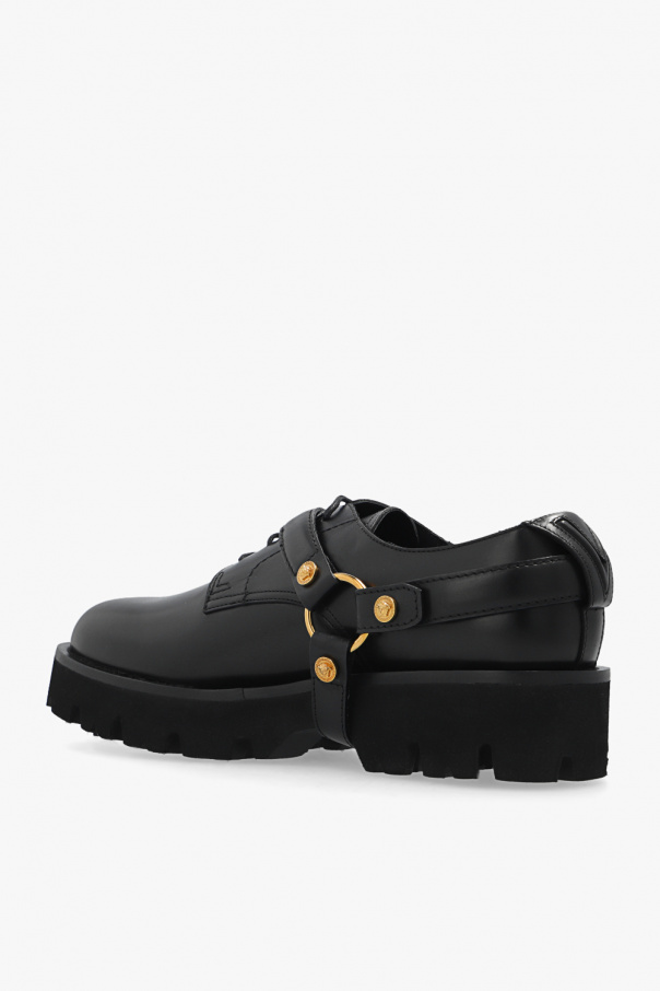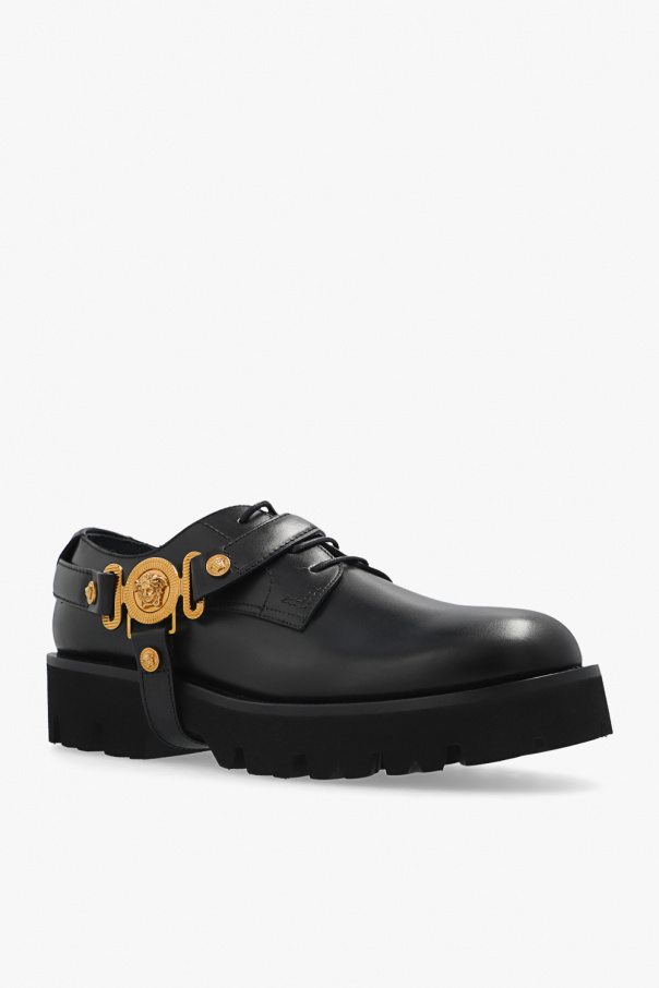 Black Derby shoes from Versace. Made from leather, this lace-up model sits on a black rubber sole and showcases a detachable harness accentuated with gold-tone Medusa Biggie hardware.