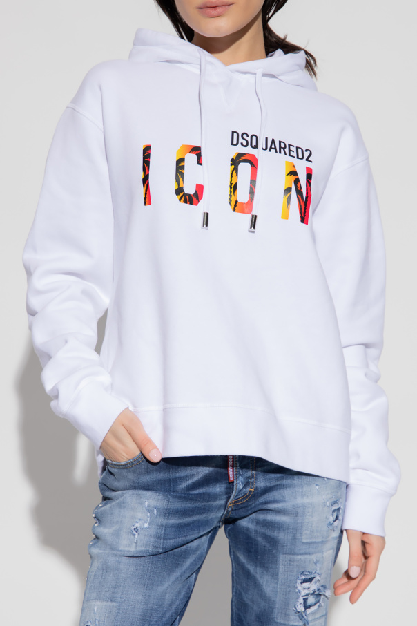 White sweatshirt with a drawstring hood from Dsquared2. Crafted from cotton jersey, this style features an orange, yellow and black floral print with the brand's logo, long sleeves and a ribbed bottom hem and cuffs.