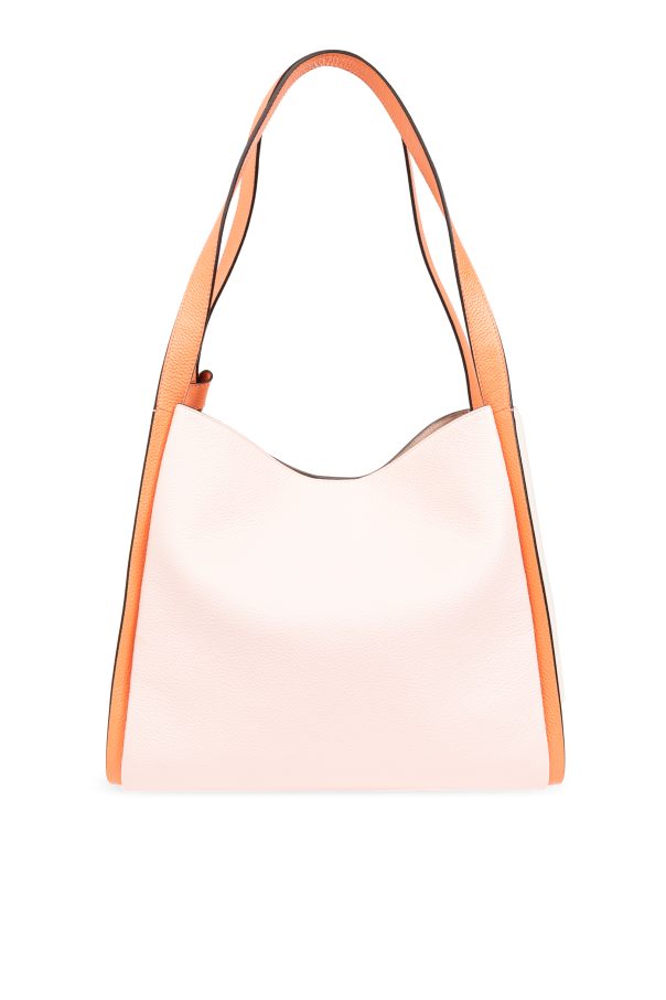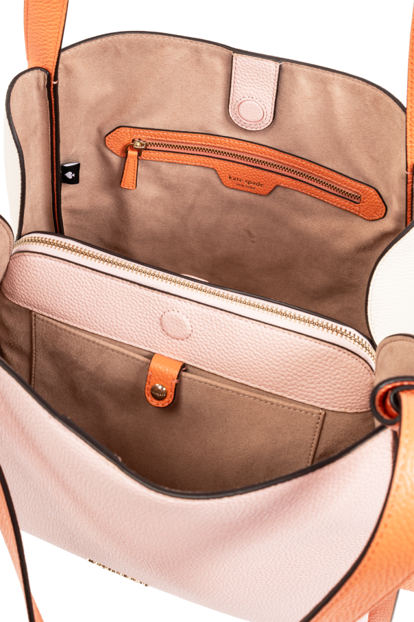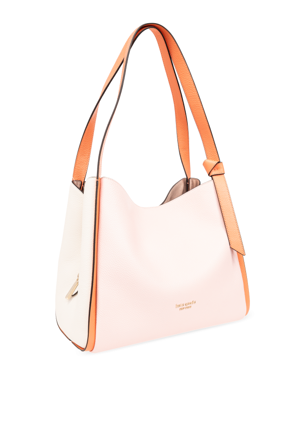 Introducing the Kate Spade 'Knot' Shopper Bag, a masterpiece of modern elegance and practicality. Crafted from 100% premium leather with a smooth texture, this bag in a delicate pink hue, accented with vibrant orange, epitomizes contemporary chic. Its slightly trapezoidal shape, softened with rounded edges, offers a refreshing take on the classic shopper silhouette. The interior, lined with a soft beige fabric, features two separate compartments, enhancing organization and accessibility. For added convenience, it includes two zippered pockets and an additional snap pocket, perfect for securing your valuables. The bag's long handles allow for comfortable shoulder wear, making it an ideal choice for both daily use and more formal occasions. A magnetic closure ensures your belongings are safe and easily accessible, while the discreetly placed logo on the exterior adds a touch of designer prestige. This bag's color palette and minimalist design make it a versatile addition to any wardrobe, embodying both functionality and style. Why Choose This Product? Exquisite craftsmanship from 100% genuine leather. Unique pink and orange color scheme, offering a bold yet sophisticated look. Practical design with multiple pockets for organization. Versatile for both casual and formal outfits. Designed by the renowned Kate Spade, ensuring quality and style.