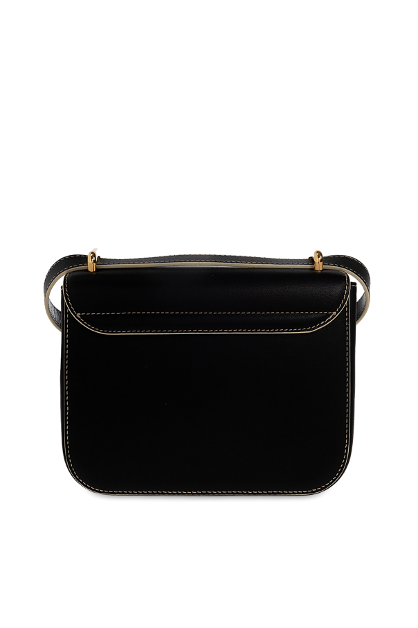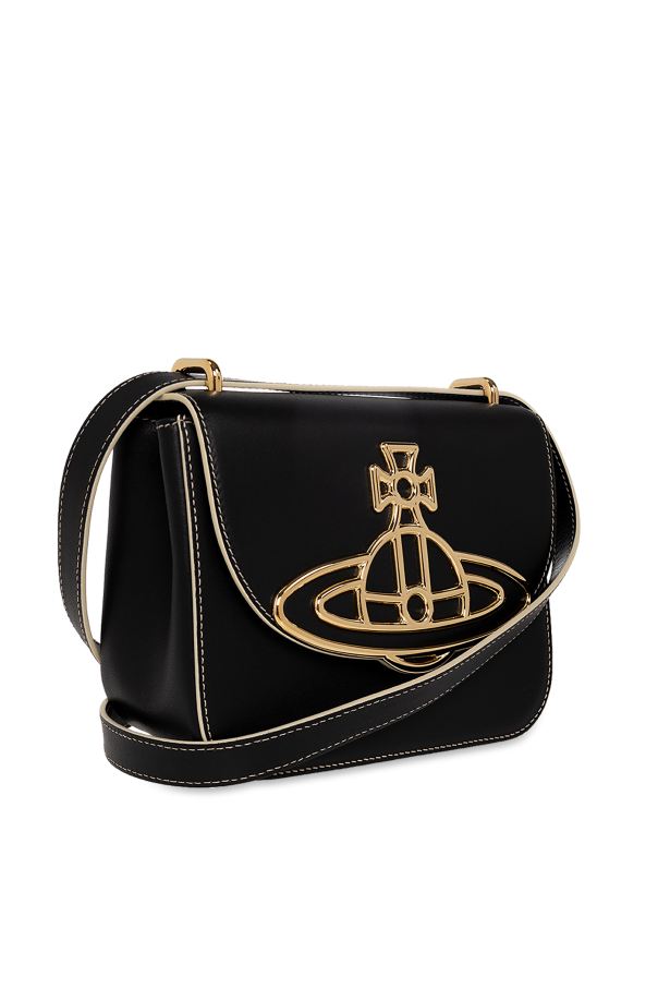 Black ‘Linda’ shoulder bag from Vivienne Westwood. Crafted from calf leather, this model features a magnetic snap closure, metal logo appliqué, white stitching details, detachable and adjustable shoulder strap, gold-tone metal hardware and one internal compartment with one card slot.